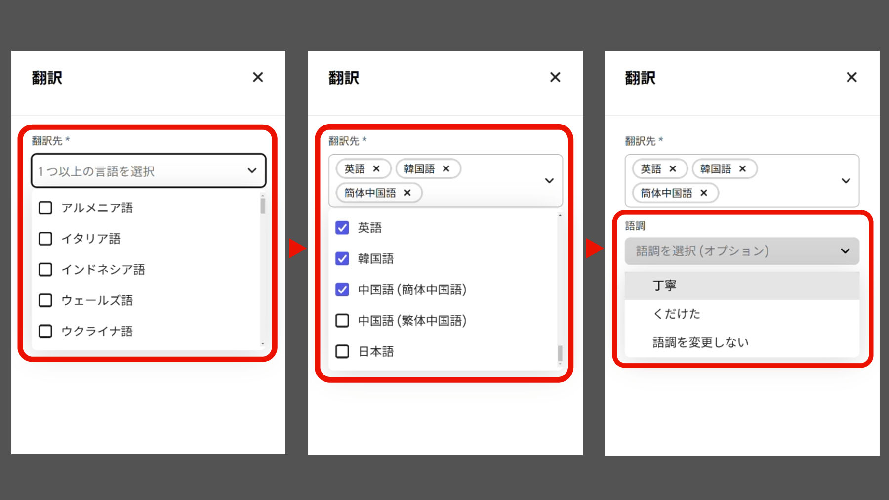 2. 「翻訳先ドロップダウン」から翻訳したい言語を1つ以上選択します。(同時に複数言語を選択することもできます。)また、翻訳元の言語は自動的に認識されます。続いて、「語調ドロップダウン」から希望する語調を選択します。