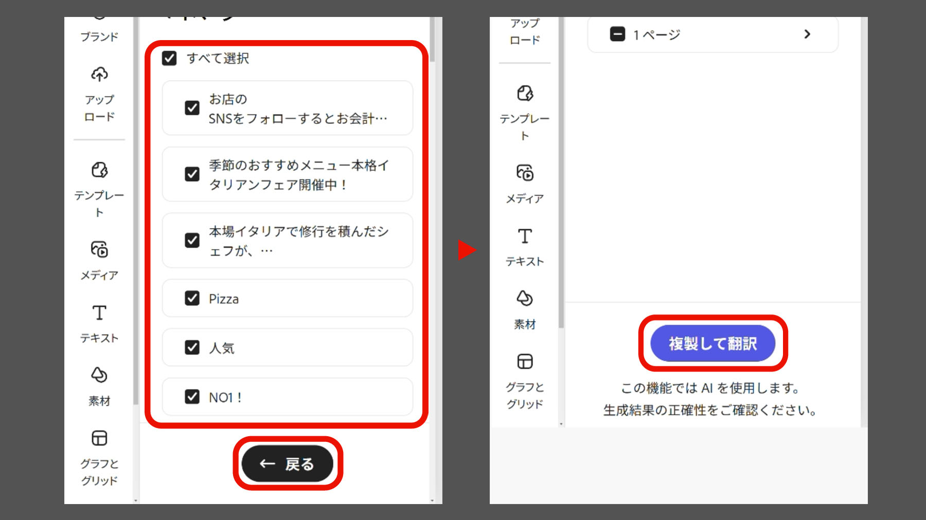 3. 「翻訳対象のページ」を選択してメニューを開き、各ページで翻訳するテキストオブジェクトを選択します。続いて、「戻る」を選択して前の画面に戻り、「複製して翻訳」を選択します。