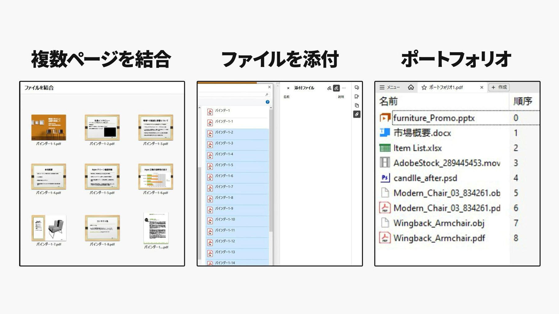 Acrobatでは、目的に応じて3つの異なる方法でファイルを結合することができます。
