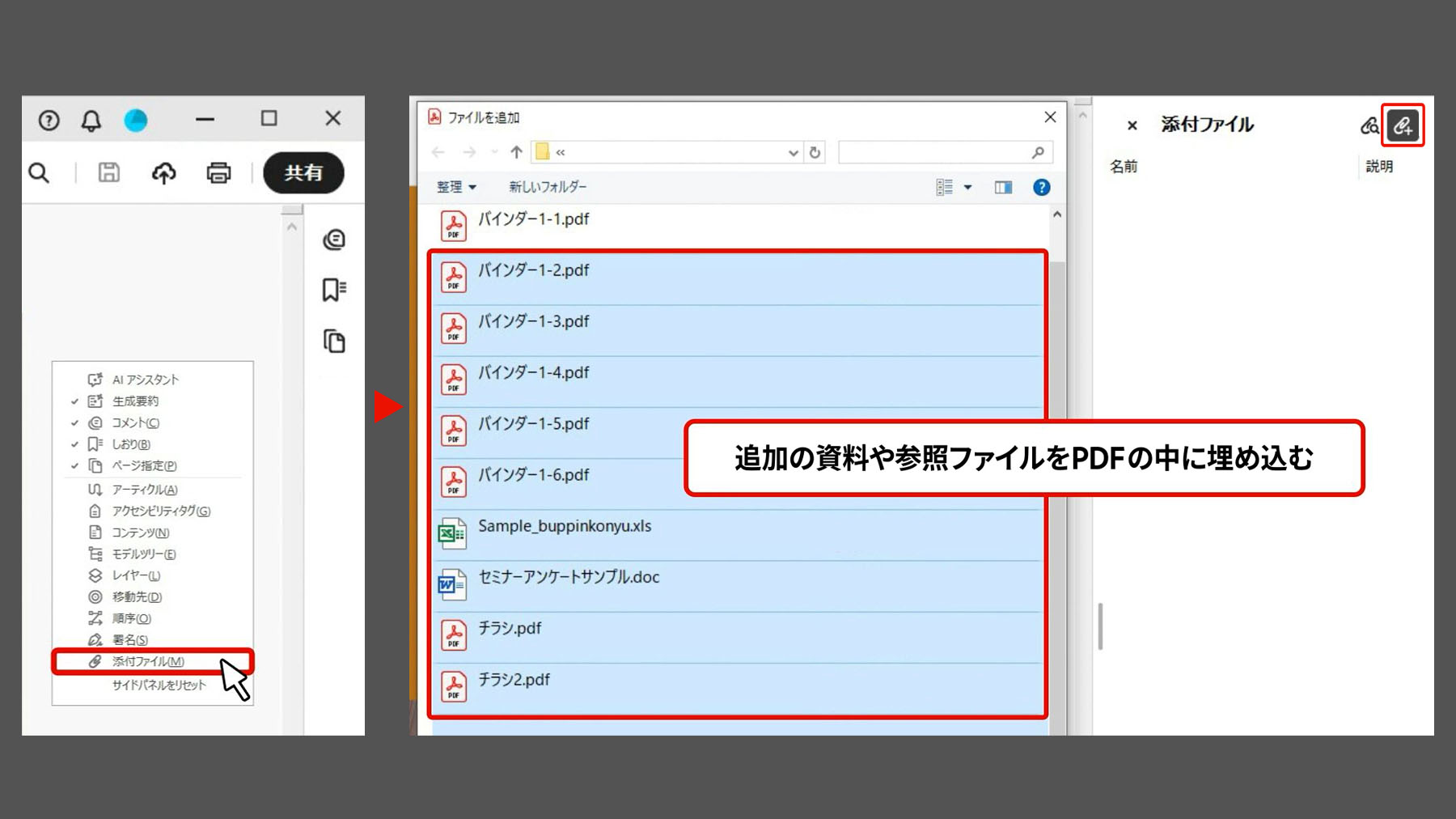 元のPDFデータはそのままに、追加の資料や参照ファイルをPDFの中に埋め込むことができます。添付ファイルとしてまとめて扱えるため、複数のファイルを個別に送るなどの手間を省くことができます。