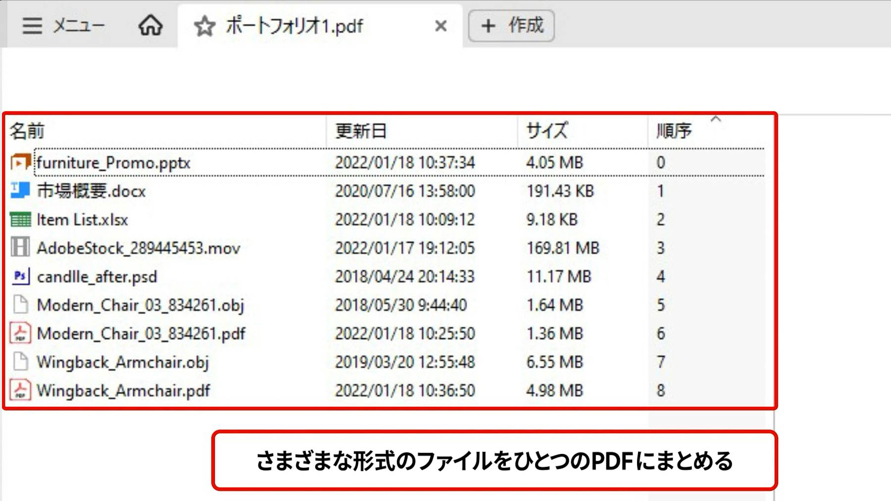 異なる形式のファイルをPDFポートフォリオとしてまとめる方法です。