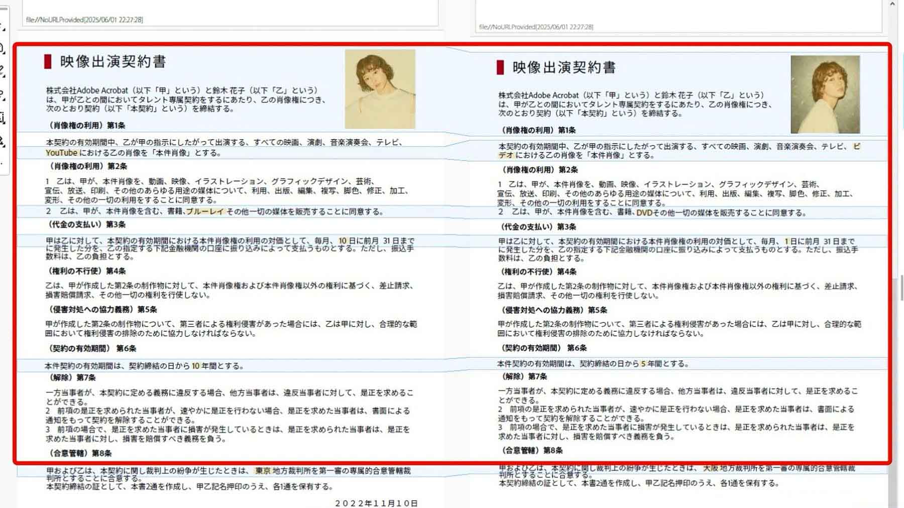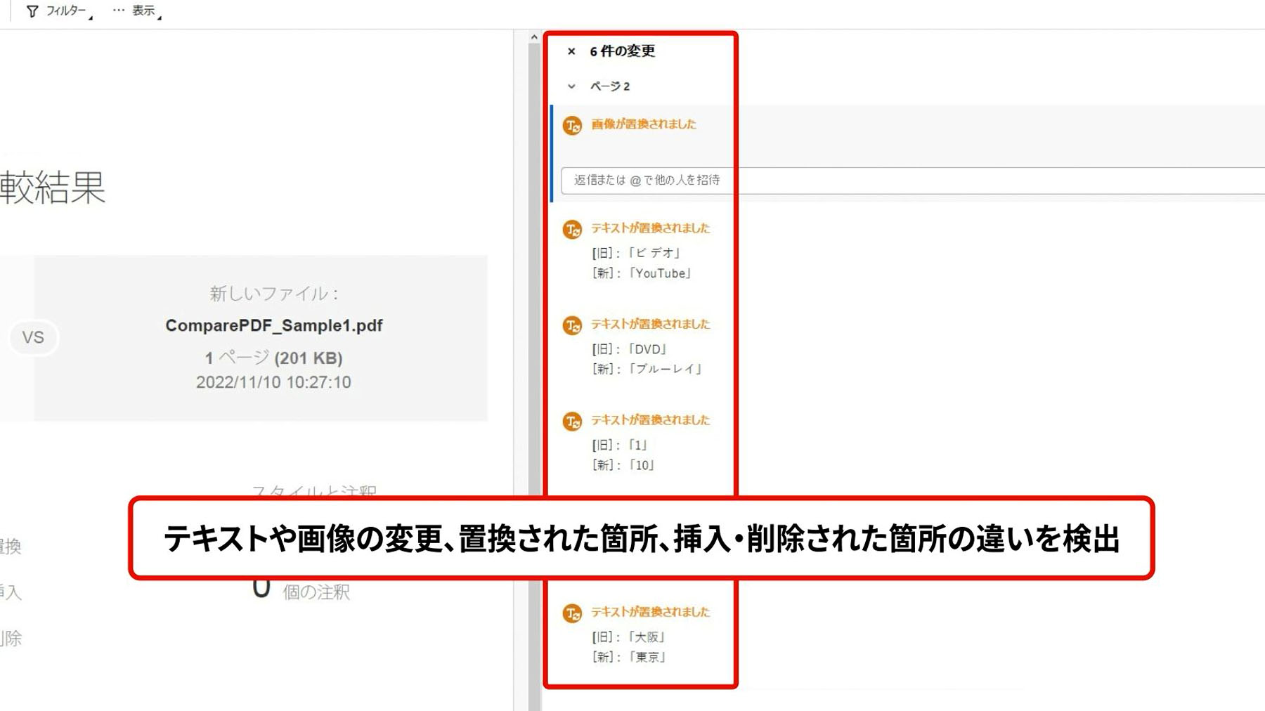 Acrobatでは、テキストや画像の変更はもちろん、置換された箇所や、挿入・削除された箇所の違いまで自動で検出し、色分けしてハイライト表示します。