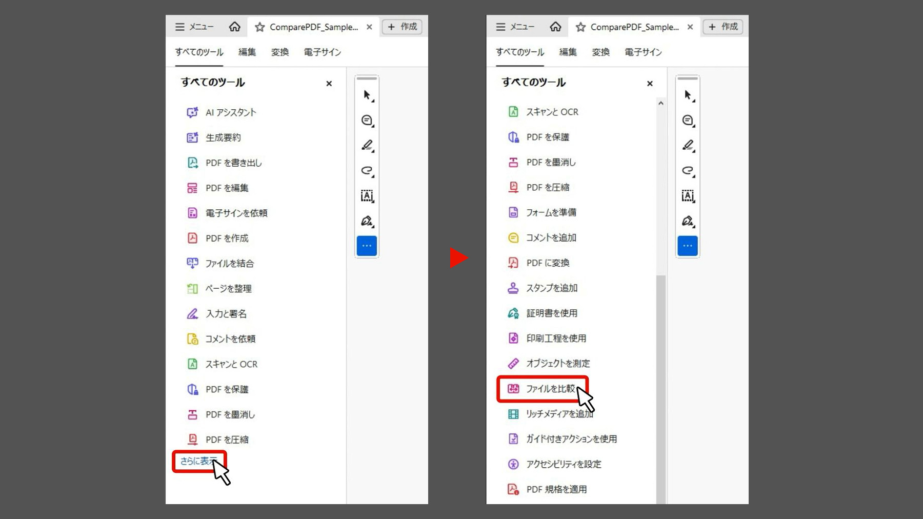 比較機能を使う際は、まず「すべてのツール」の「さらに表示」から「ファイルを比較」を選択します。
