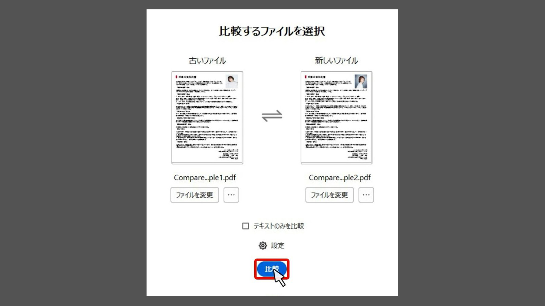 次に、比較したい2つのPDFファイルを選び、「比較」をクリックします。