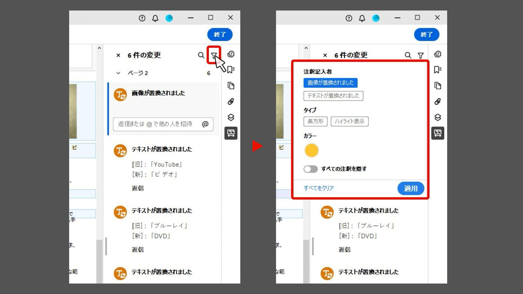 ツールバーの「フィルター」機能を使用することで、テキスト変更や書式変更、画像の追加・削除など、特定の差分だけを絞り込んで表示することも可能です。