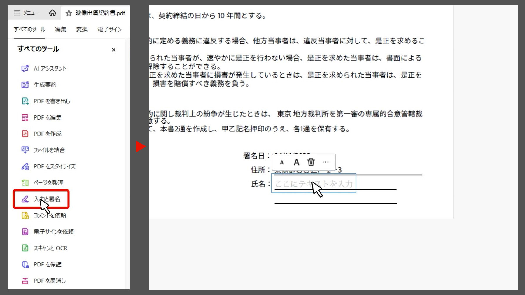 「すべてのツール」から「入力と署名」を選択します。署名を挿入したい場所をクリックすると、テキスト入力で署名を追加できます。