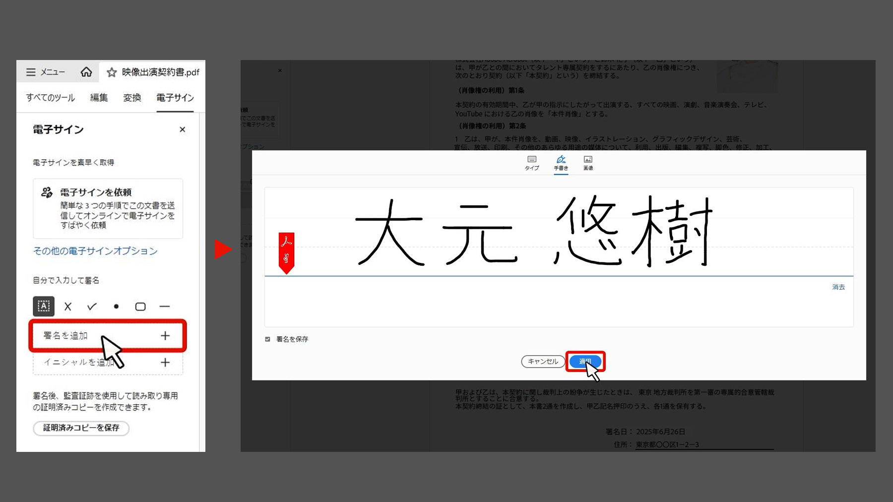 また、「署名を追加」から、手書きのサインや画像を使って署名を登録することも可能です。