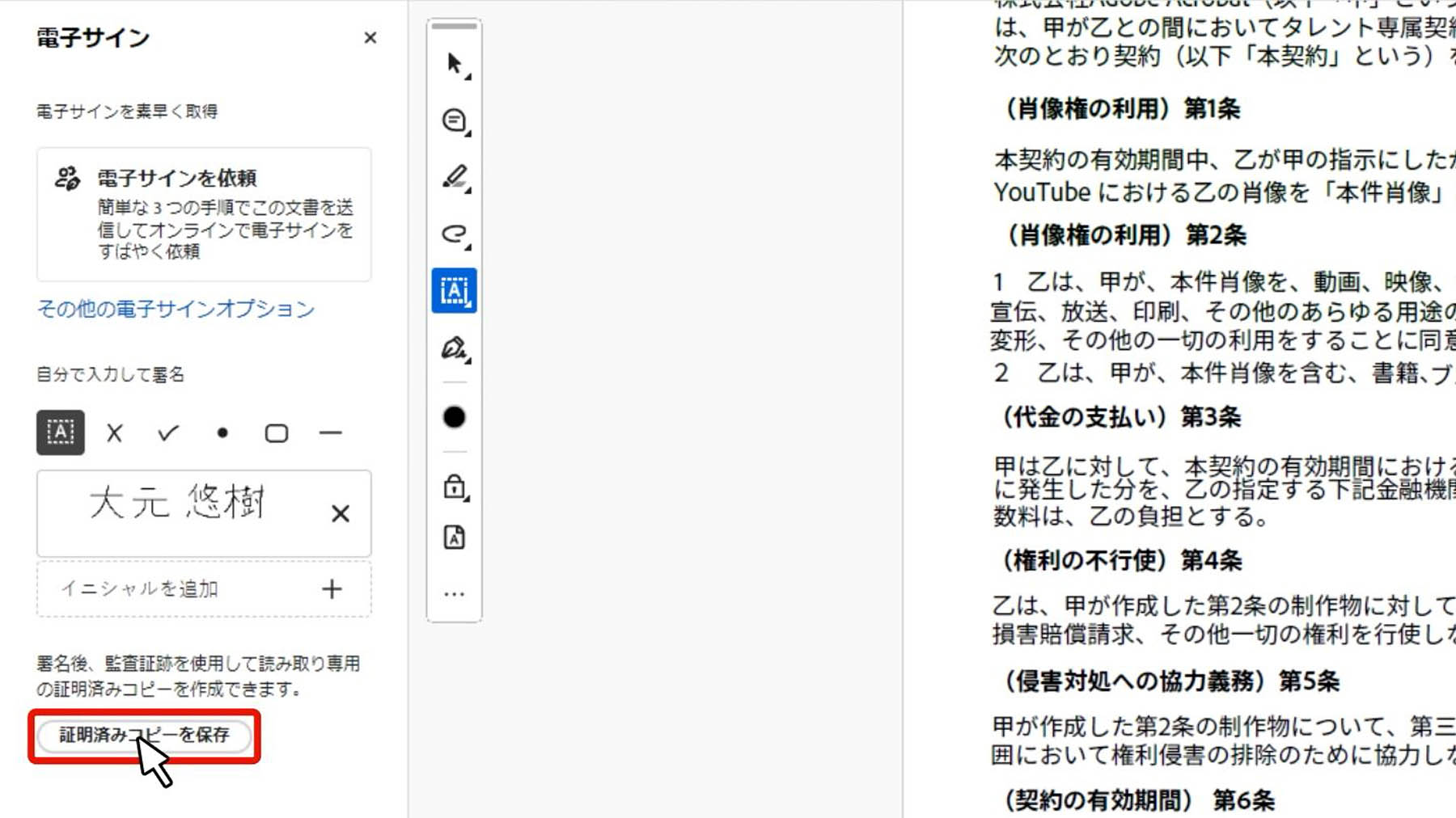 フォントの大きさや位置を整えたら「証明済みコピーを保存」をクリックし、PDFファイルを保存します。