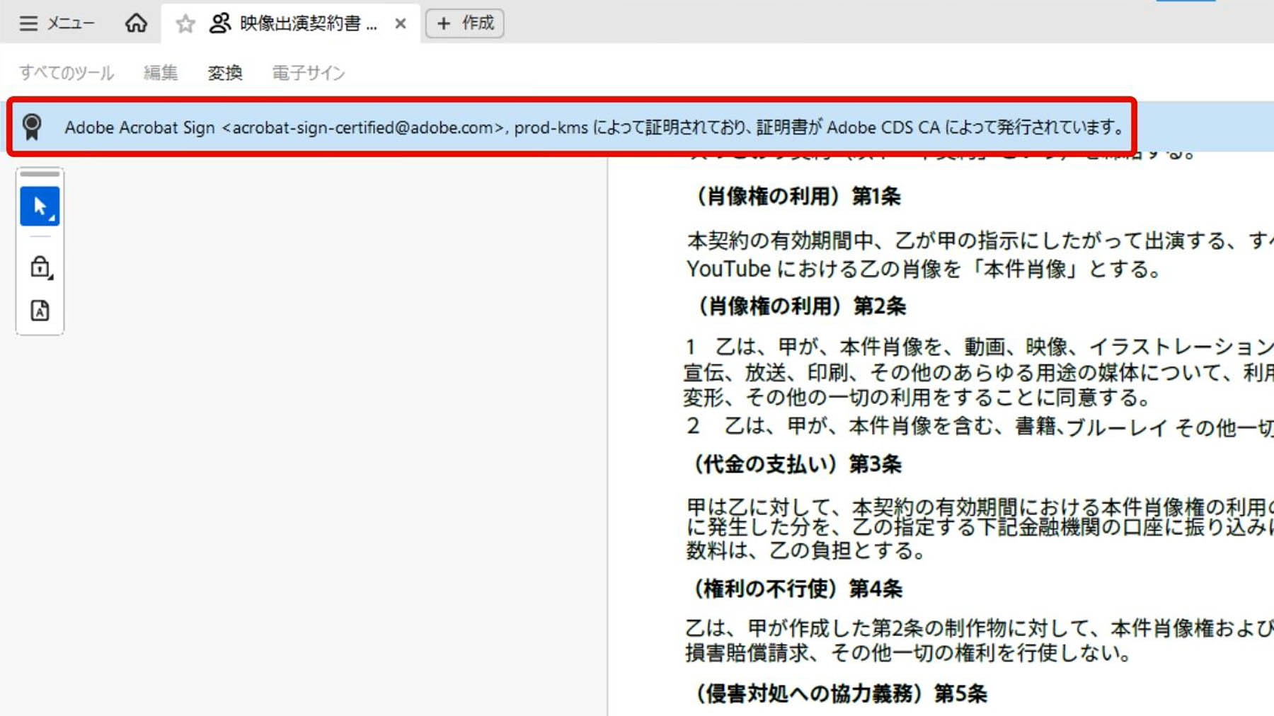 署名が完了したPDFには、「署名済み」のラベルが表示され、文書内の変更がロックされます。