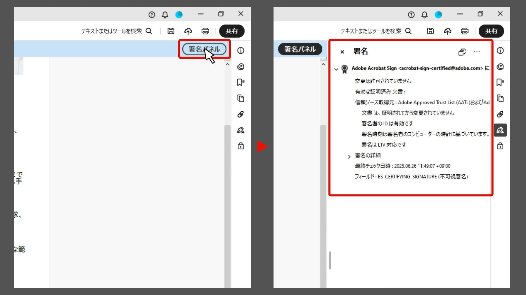 「署名パネル」を選択すると、署名者情報や証明書の詳細も簡単に確認できます。