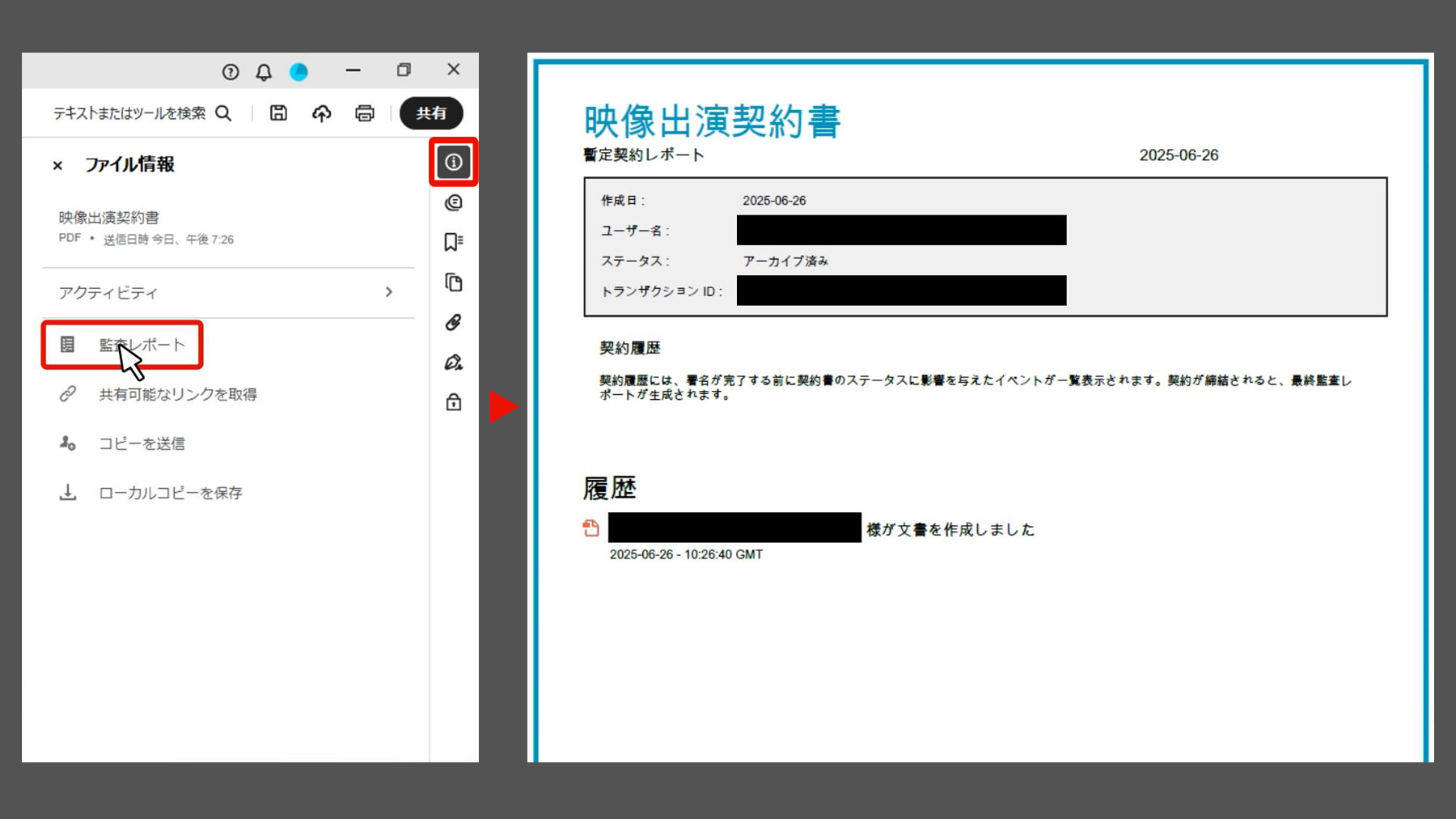 さらに、署名日時やIPアドレスなどの操作履歴が記録される「監視レポート」が自動で生成されます。これにより、署名プロセスの透明性と証拠性が確保されます。