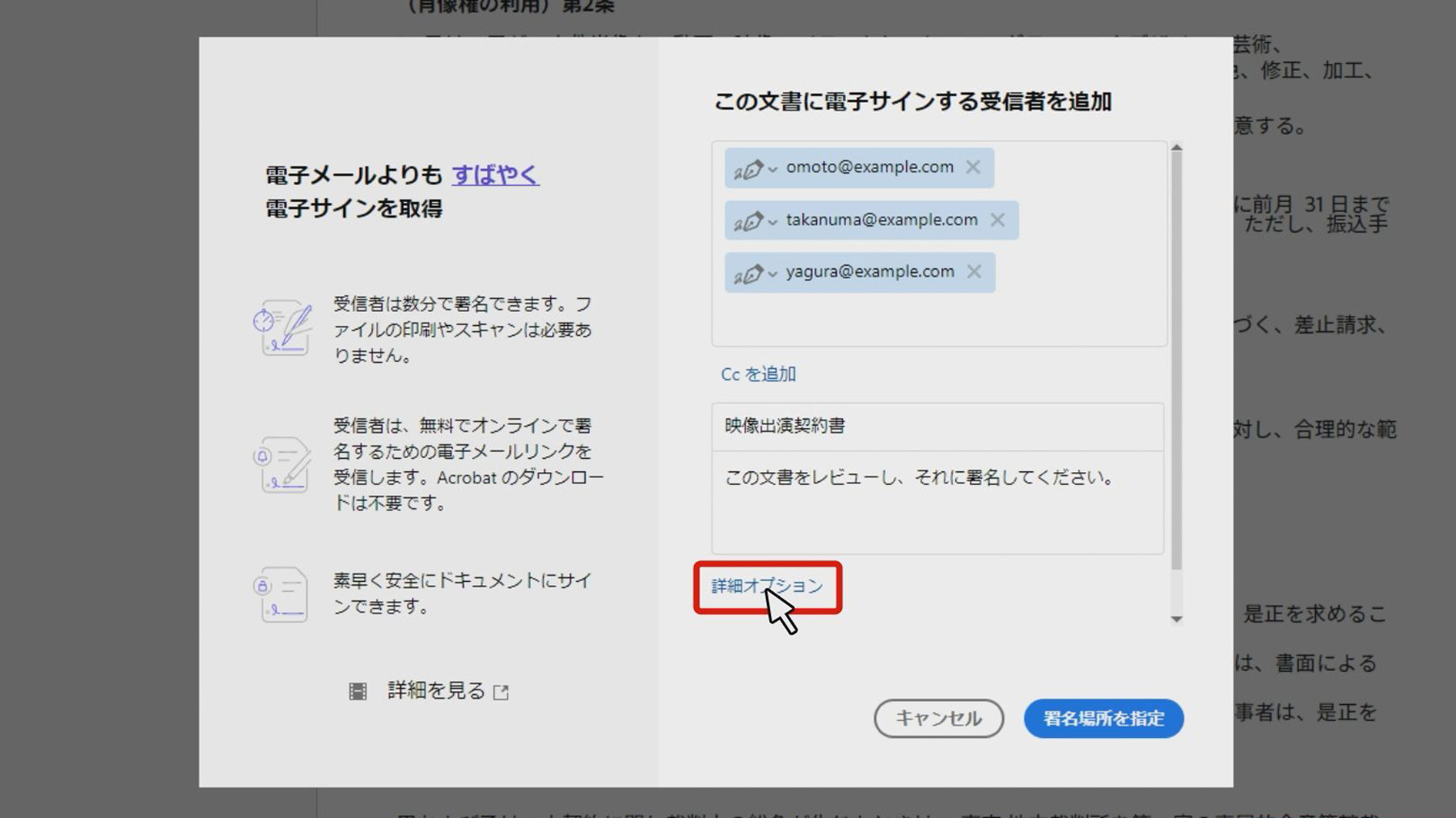 署名者の認証方法や通知の設定など、より細かな指定を行いたい場合は、「詳細オプション」をクリックします。