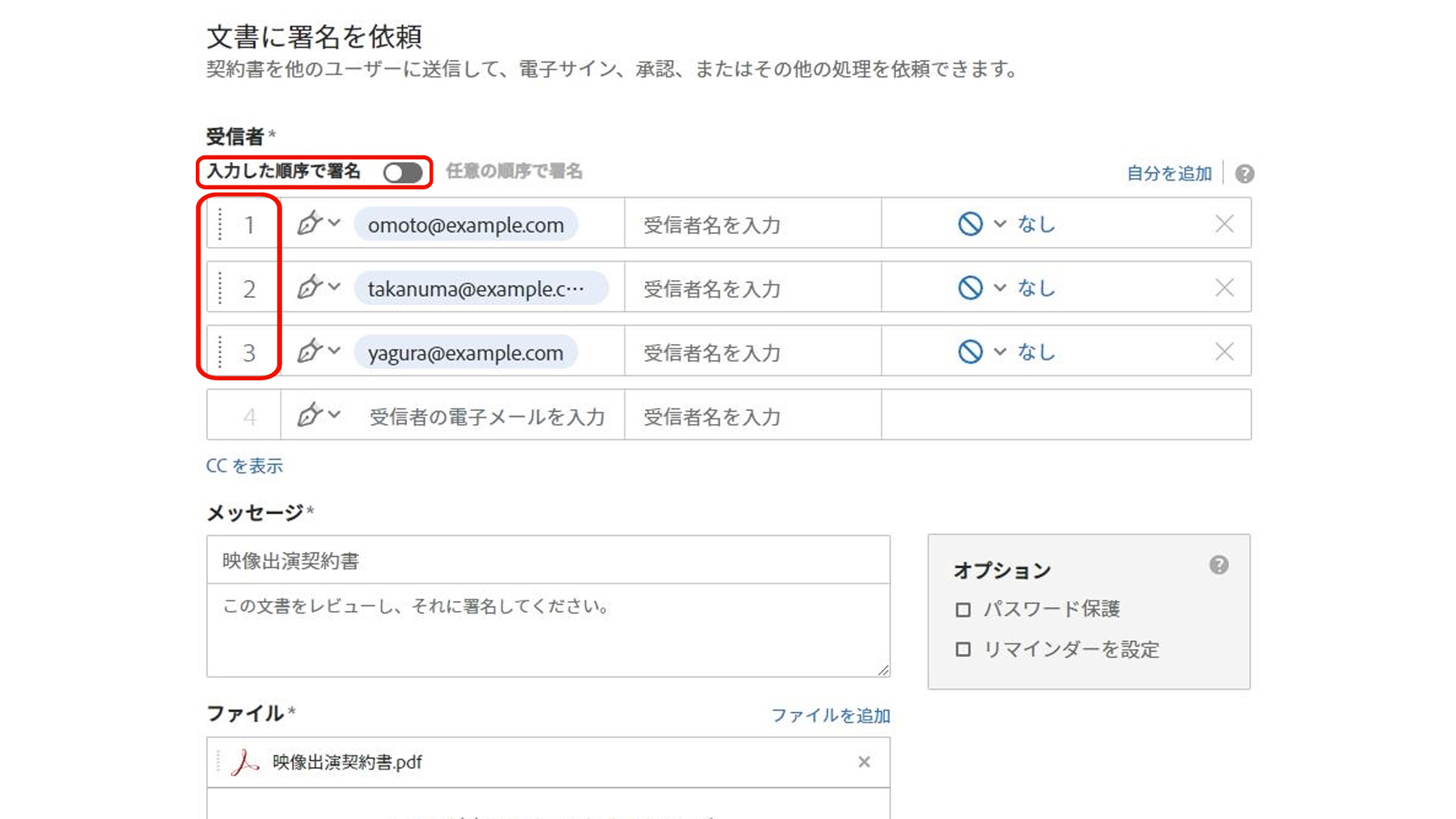 署名の順序は、デフォルトで「入力した順序で署名」がオンになっており、メールアドレスの横に表示された番号がその順序を示しています。