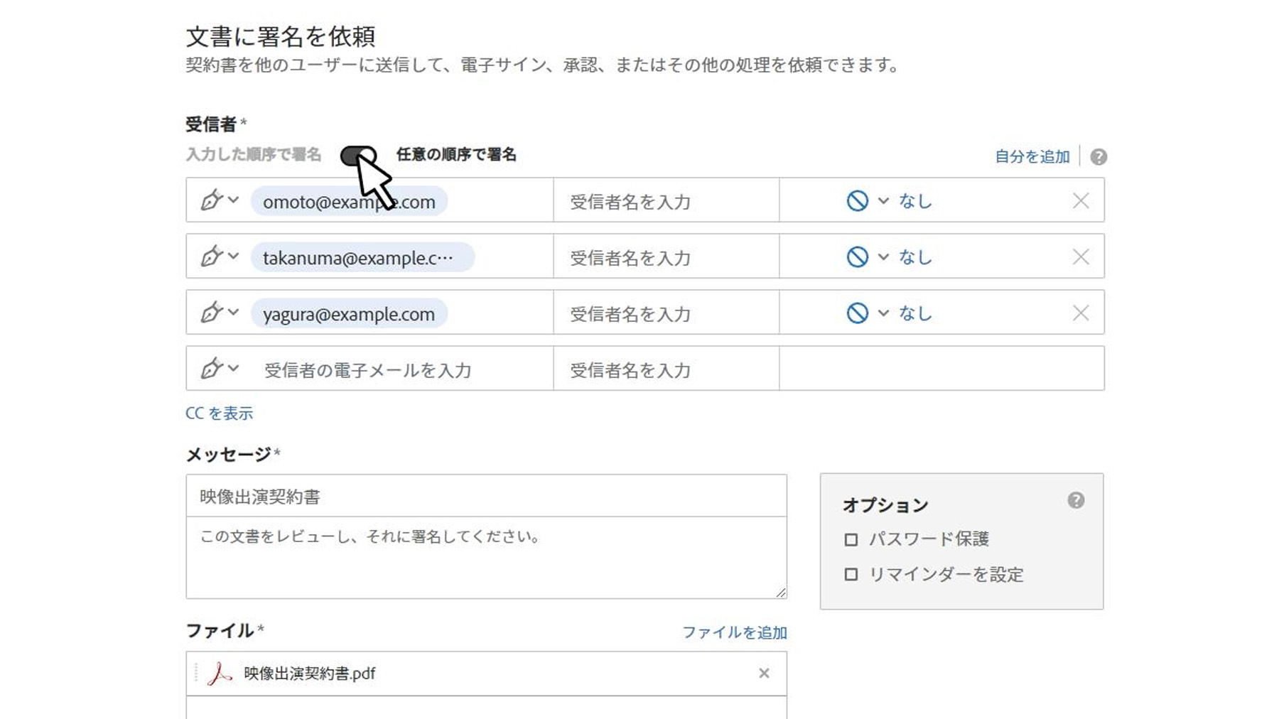 順序に関係なく署名させたい場合は、「任意の順序で署名」に切り替えることも可能です。