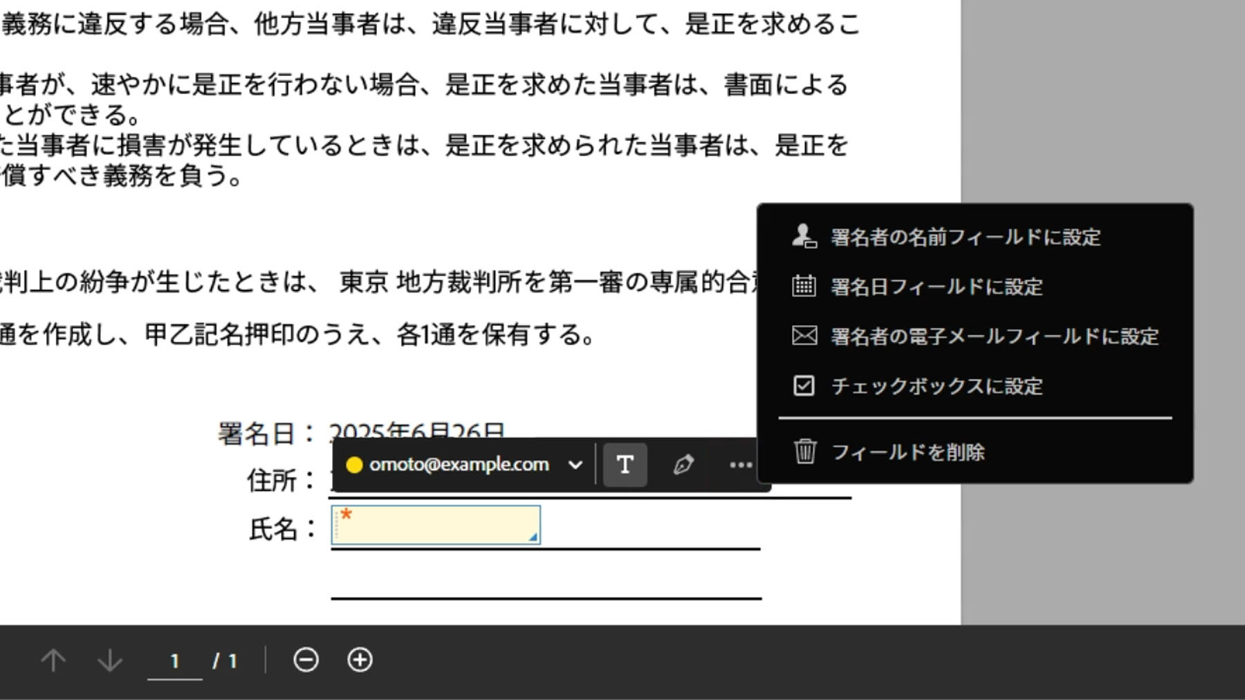 署名欄を配置するには、文書上の任意の場所をクリックし、フィールドを追加します。各フィールドのプロパティは、コンテキストメニューから細かく調整することができます。