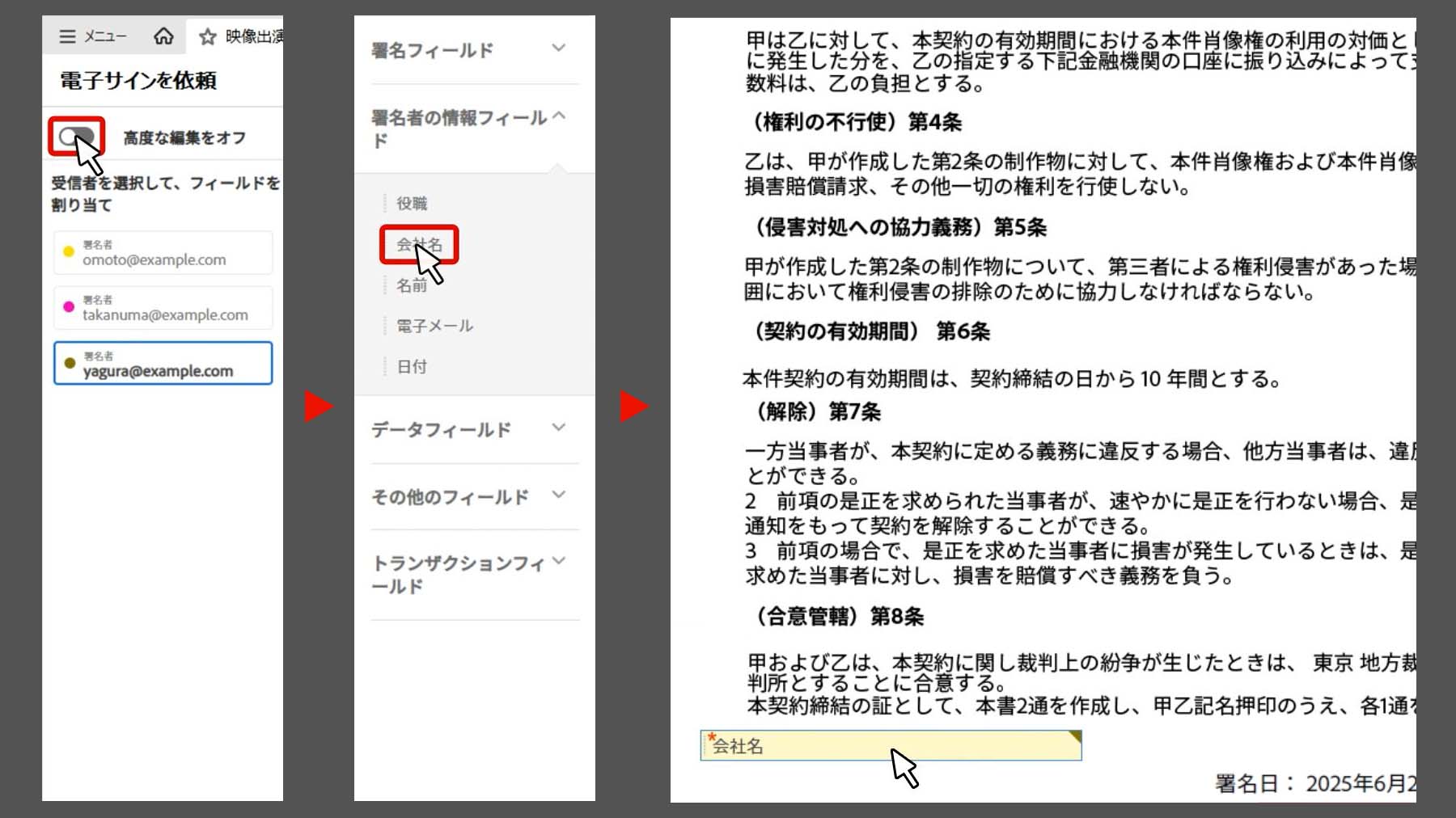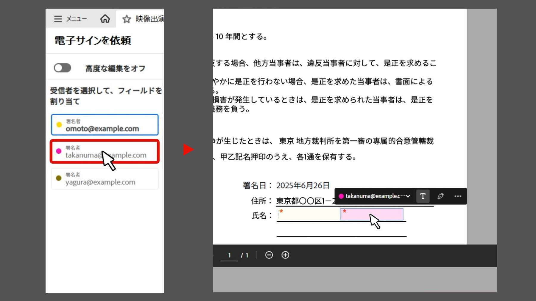 複数の署名者がいる場合は、左側のパネルから署名者を切り替え、それぞれに対応する記入フィールドを色分けして割り当てることができます。