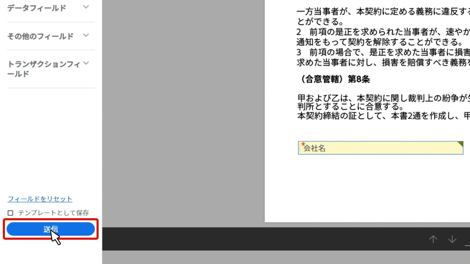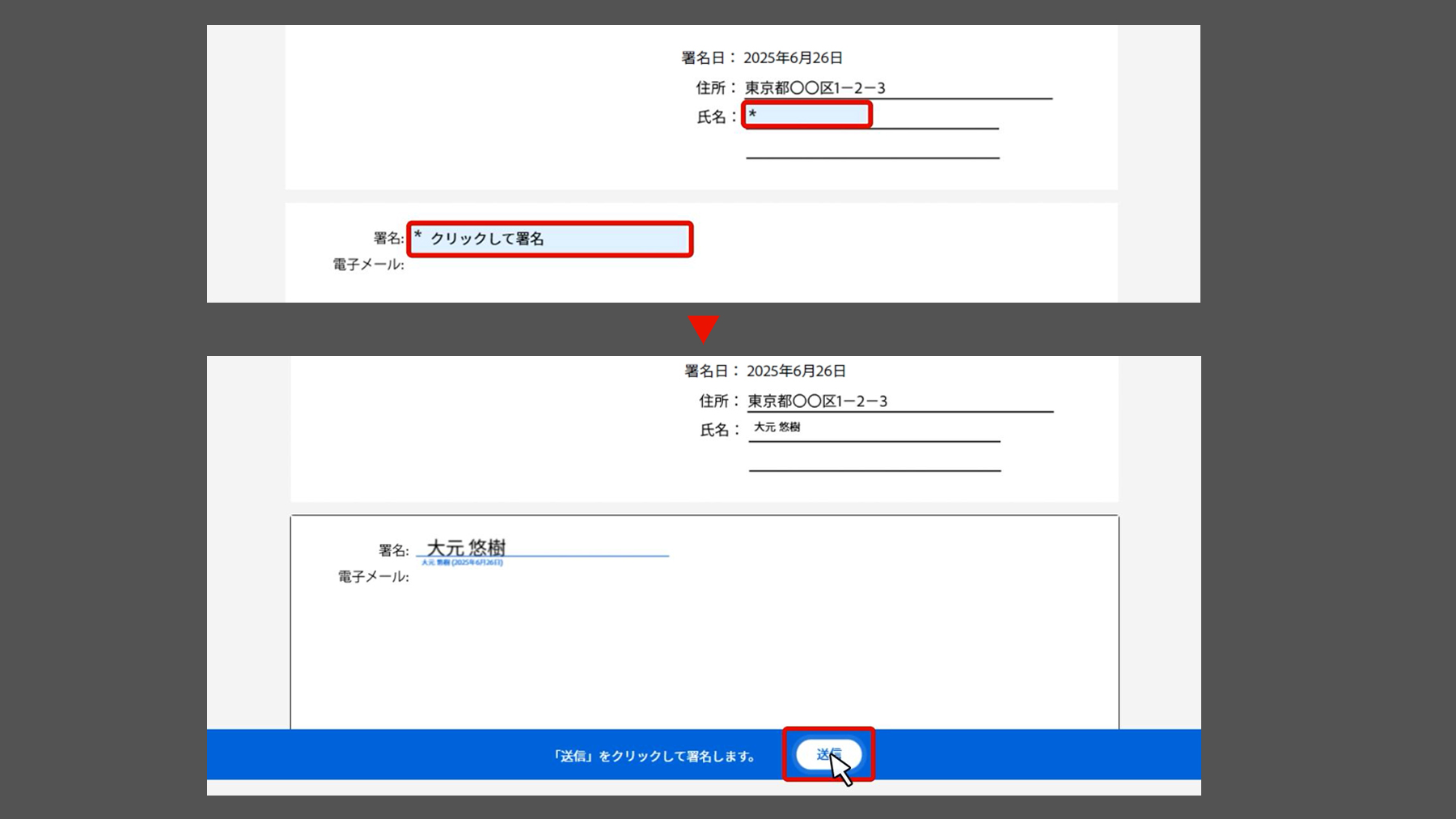 依頼された側は、ハイライトされた箇所に必要事項を入力し、「送信」ボタンを押すだけで署名が完了します。