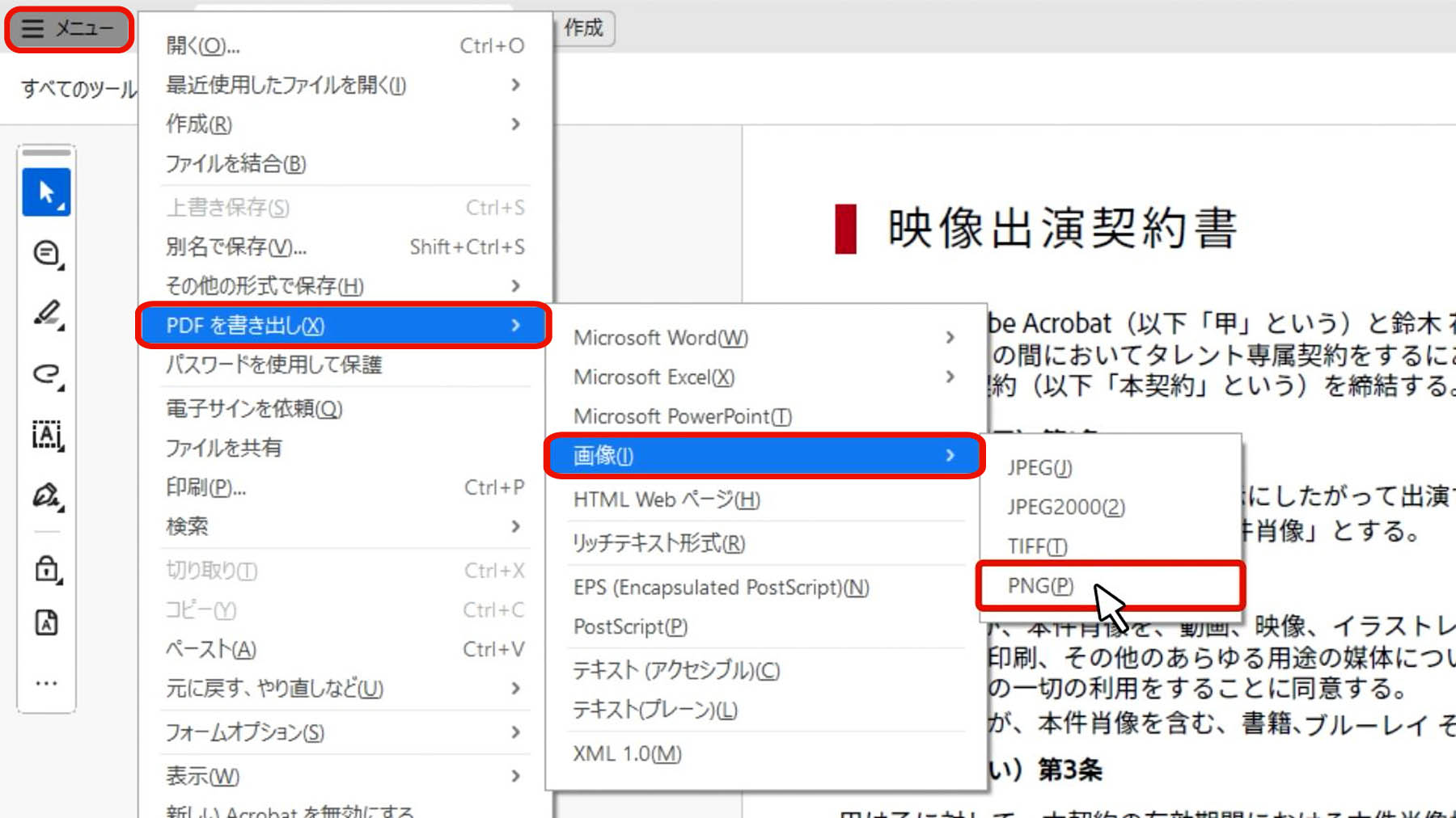 Acrobatでは、PDFのページを画像として保存したり、特定の要素だけを抽出したりと、用途に応じてさまざまな形式で書き出すことができます。