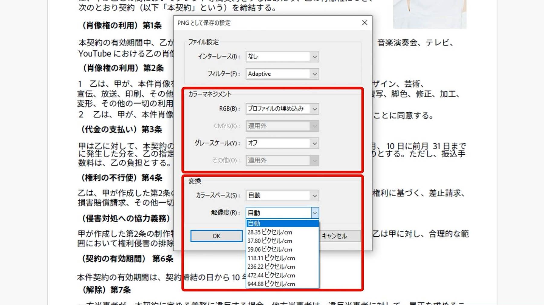 必要に応じて、画像の解像度や色も設定できます。