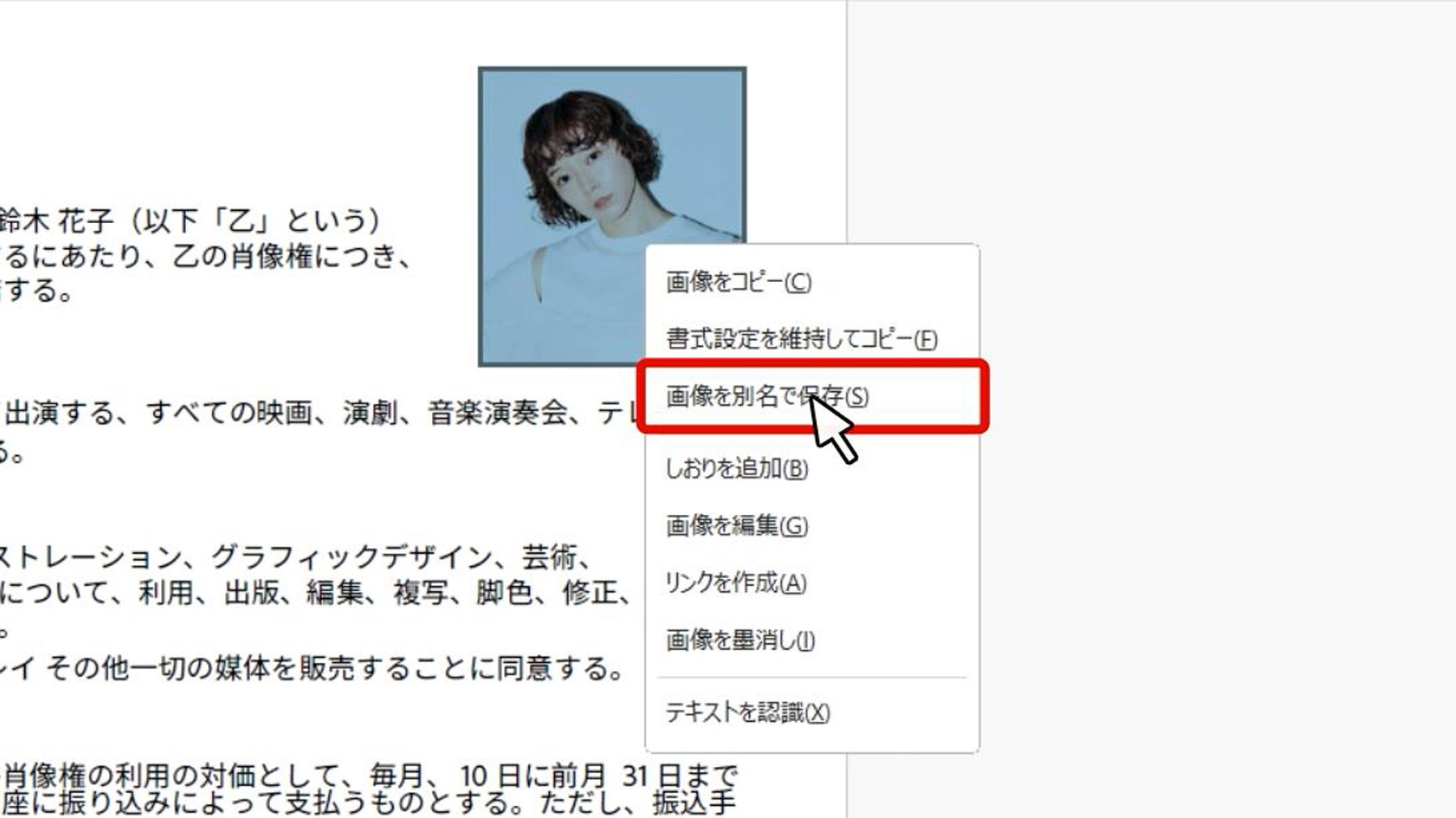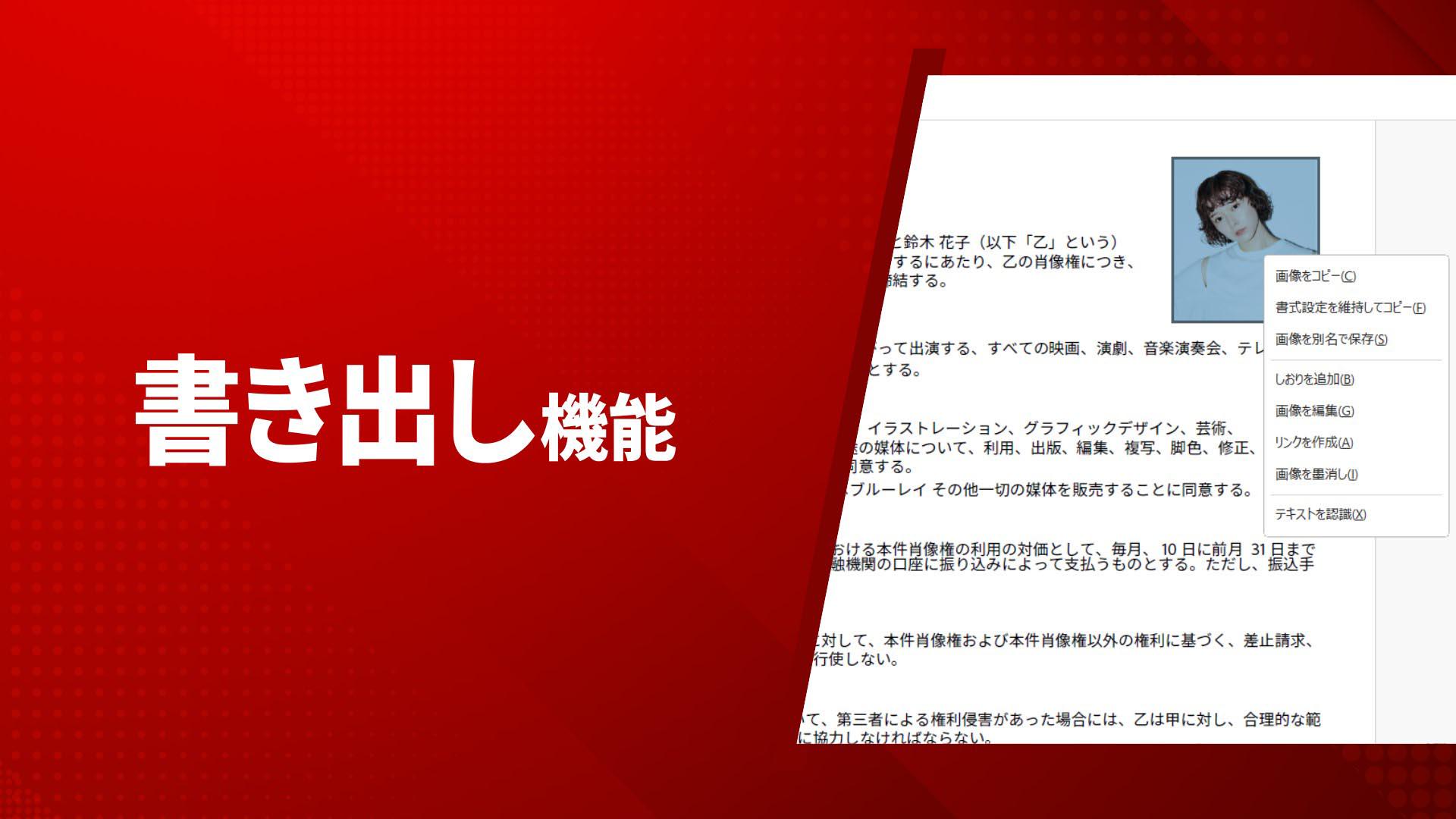 PDF内の一部分、たとえば画像だけを書き出したい場合は、対象の画像を右クリックして「画像を別名で保存」を選択します。