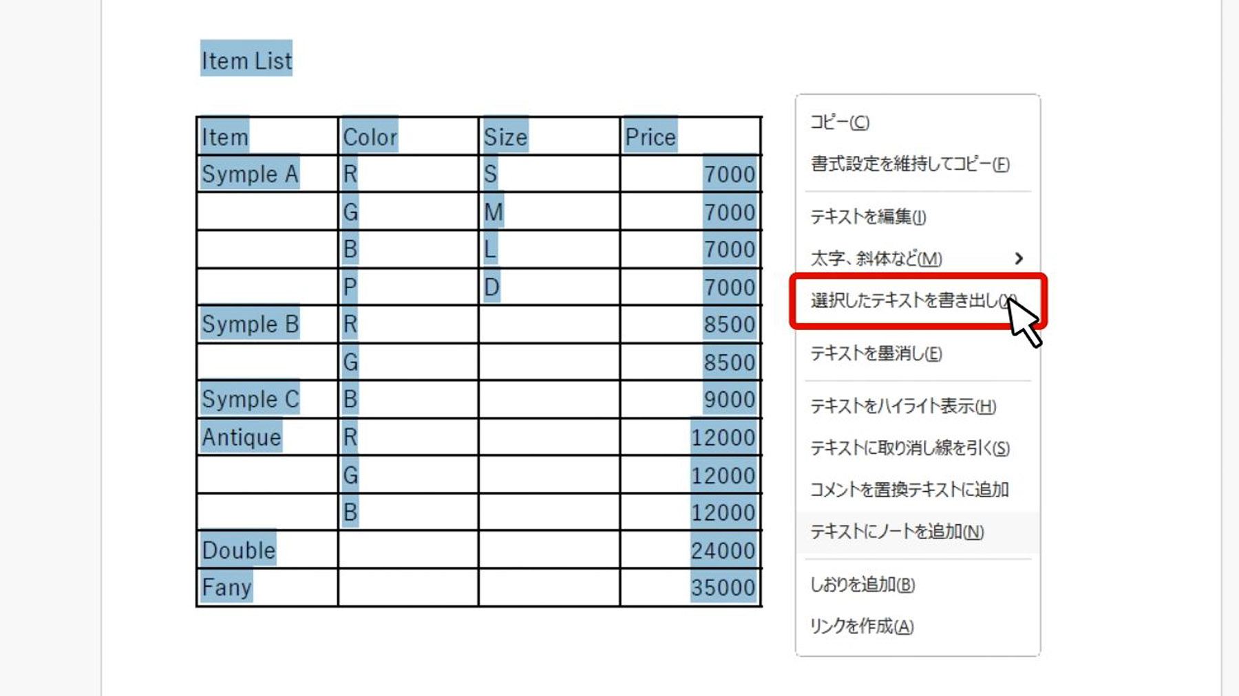 PDF上のテキストをすべて選択し、右クリックで「選択したテキストを書き出し」を選択します。