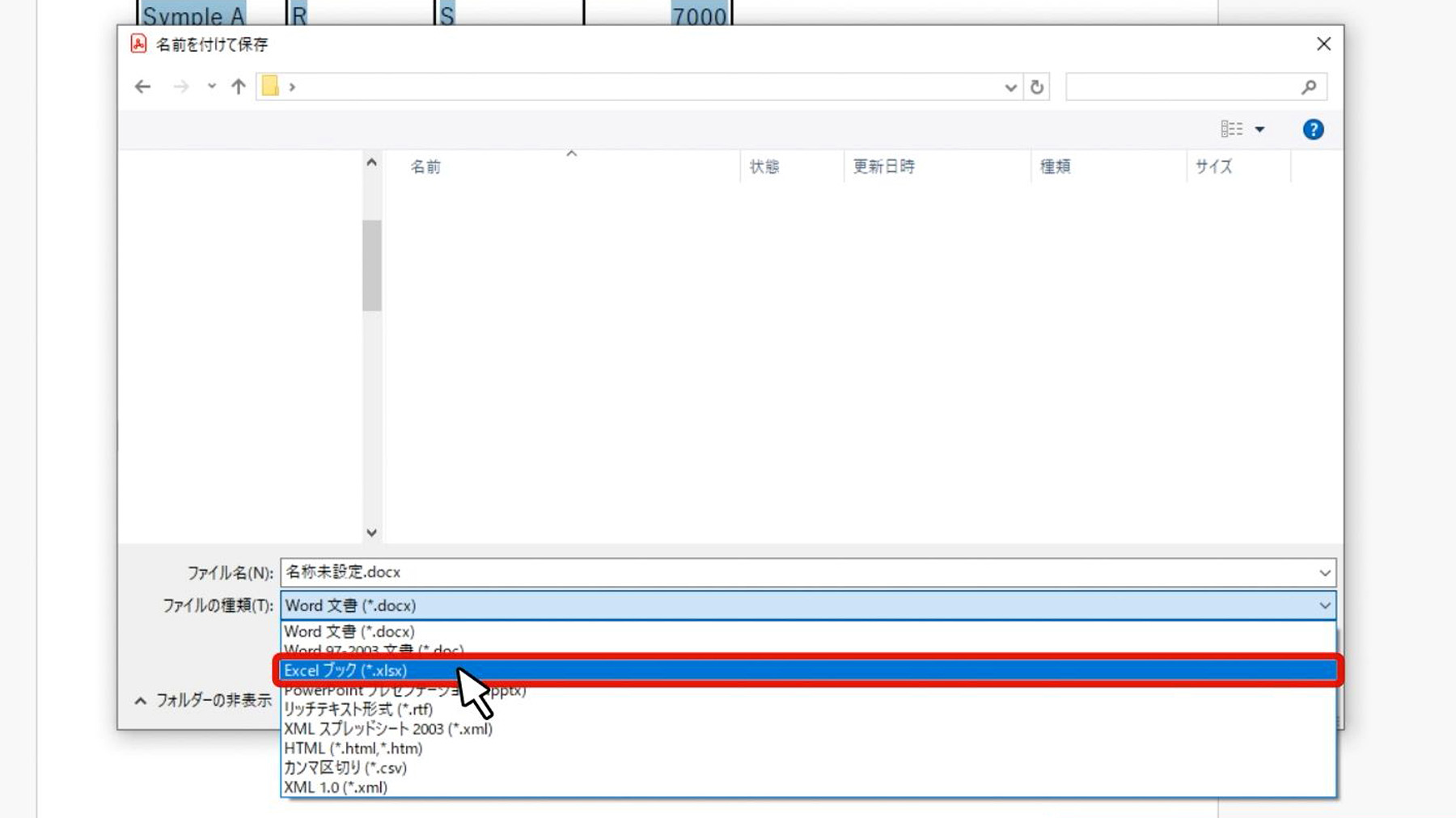 ファイルの種類から「Excel ブック」を選択することでExcelデータに変換できます。