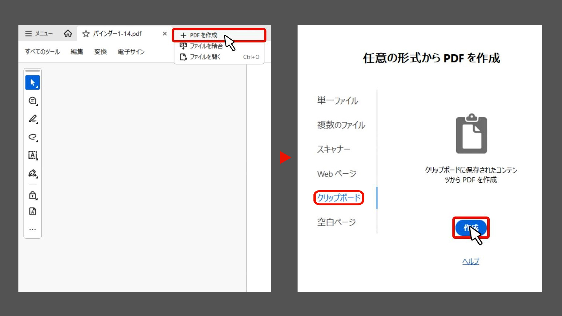 次に、画面上部の「作成」から「PDFを作成」を選択し、「クリップボード」を指定することで、コピーした内容をそのままPDFに変換できます。