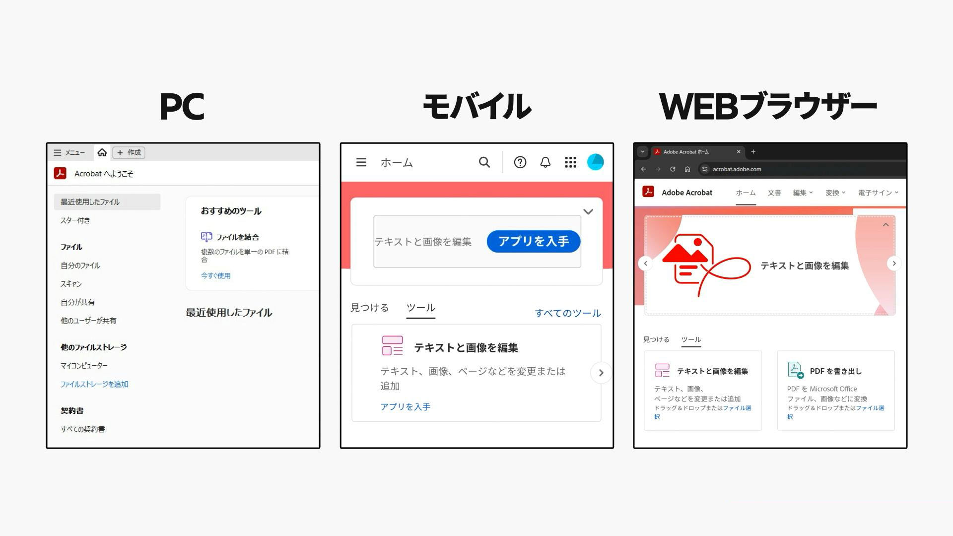 Acrobatはデスクトップのアプリケーションに加えて、モバイル、ブラウザーでも追加料金なしでご利用いただけます。