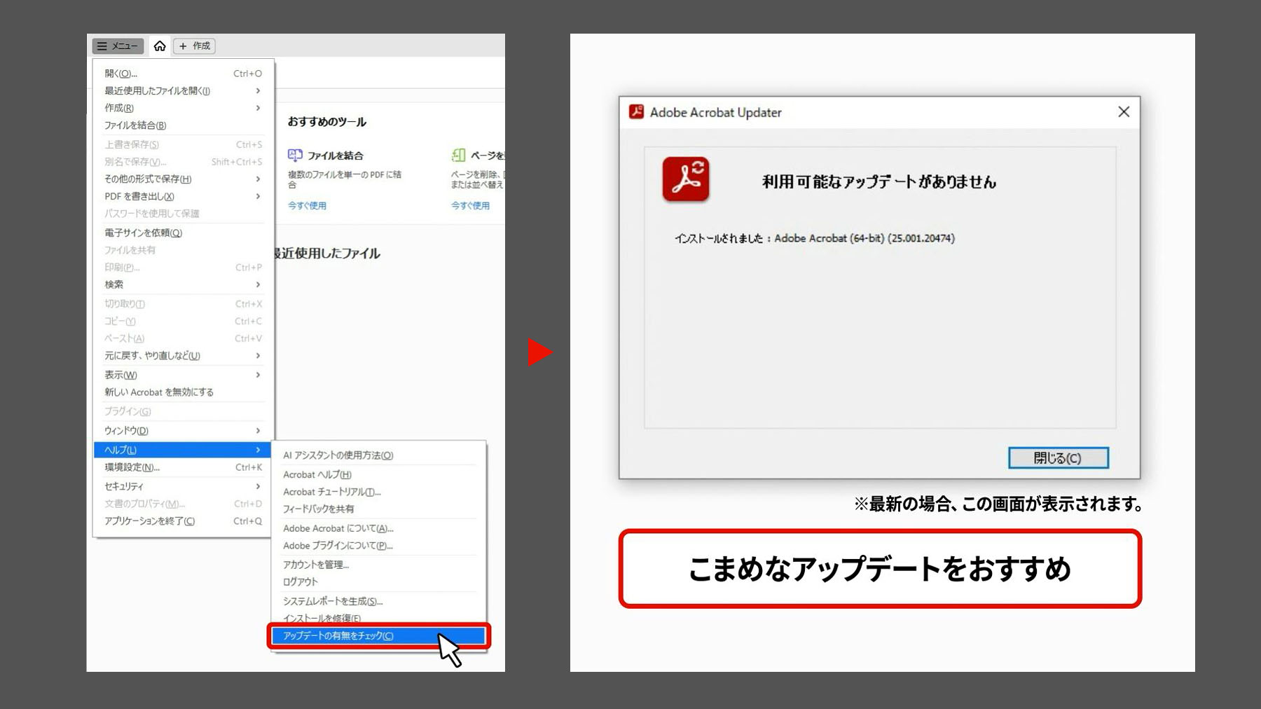 Acrobatが最新のバージョンであるかを確認します。Acrobatを開き、メニューの「ヘルプ」から「アップデートの有無をチェック」を選択します。常に最新機能を利用できるサブスクリプションを活かすため、こまめなアップデートをおすすめします。