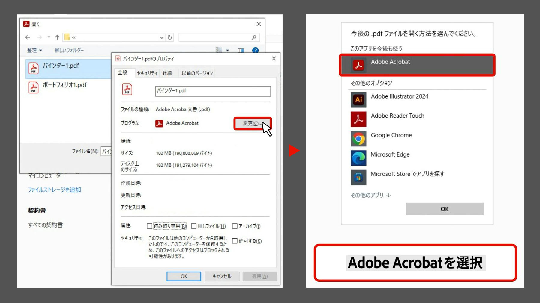 表示されたウィンドウの中から「変更」をクリックし、アプリ一覧から「Adobe Acrobat」を選択します。