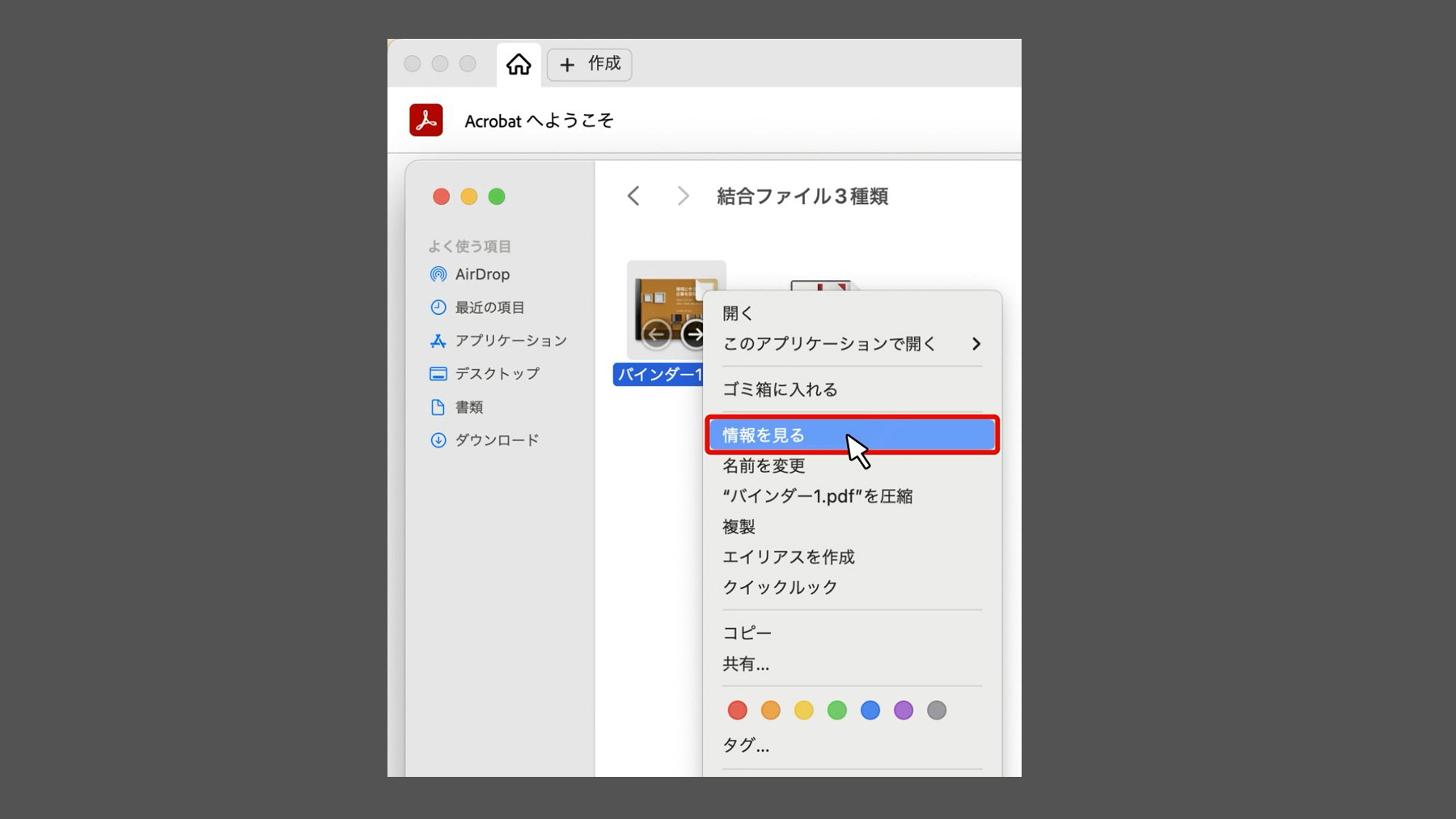PDFファイルを右クリックし、「情報を見る」を選択します。