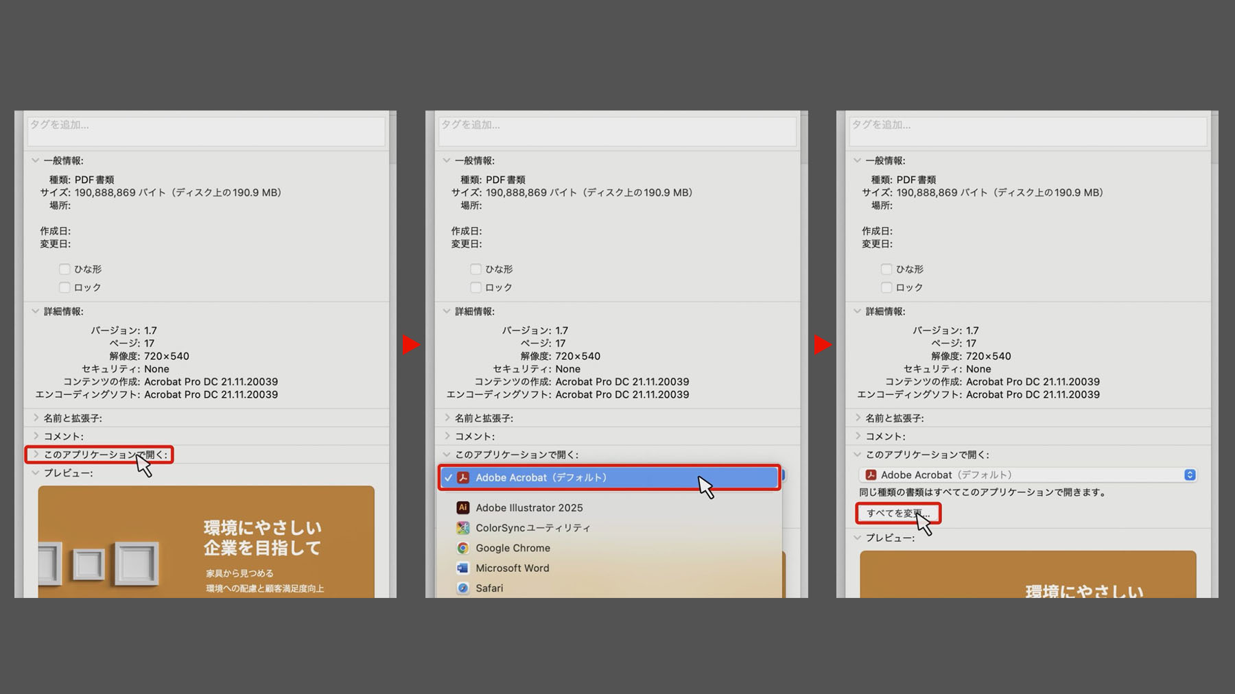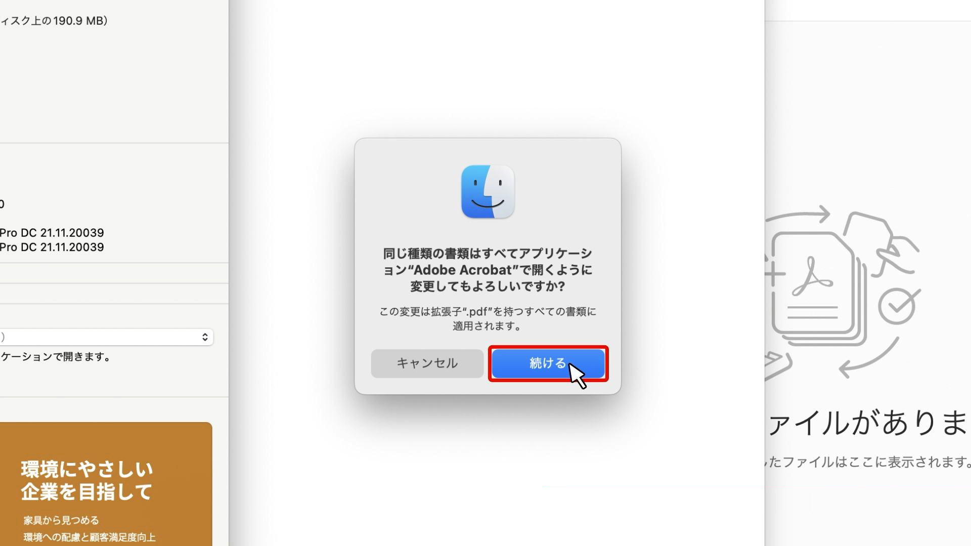 表示されたウィンドウの中から「このアプリケーションで開く」という項目をクリックします。一覧から「Adobe Acrobat」を選択し、「すべてを変更...」をクリックします。