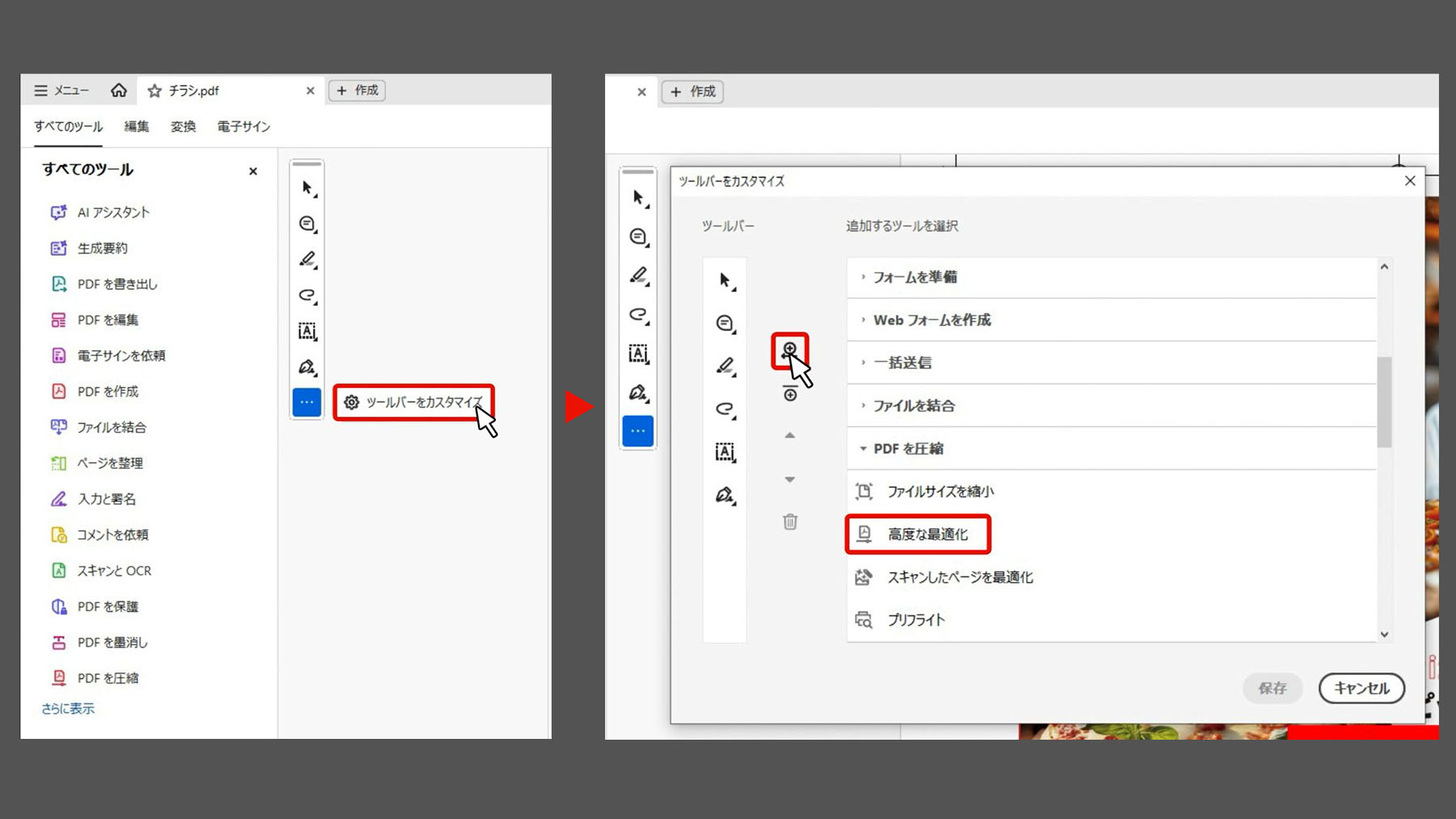 点線マークをクリックし、「ツールバーをカスタマイズ」を選択します。ツールを一つ選び、プラスボタンで追加しましょう。