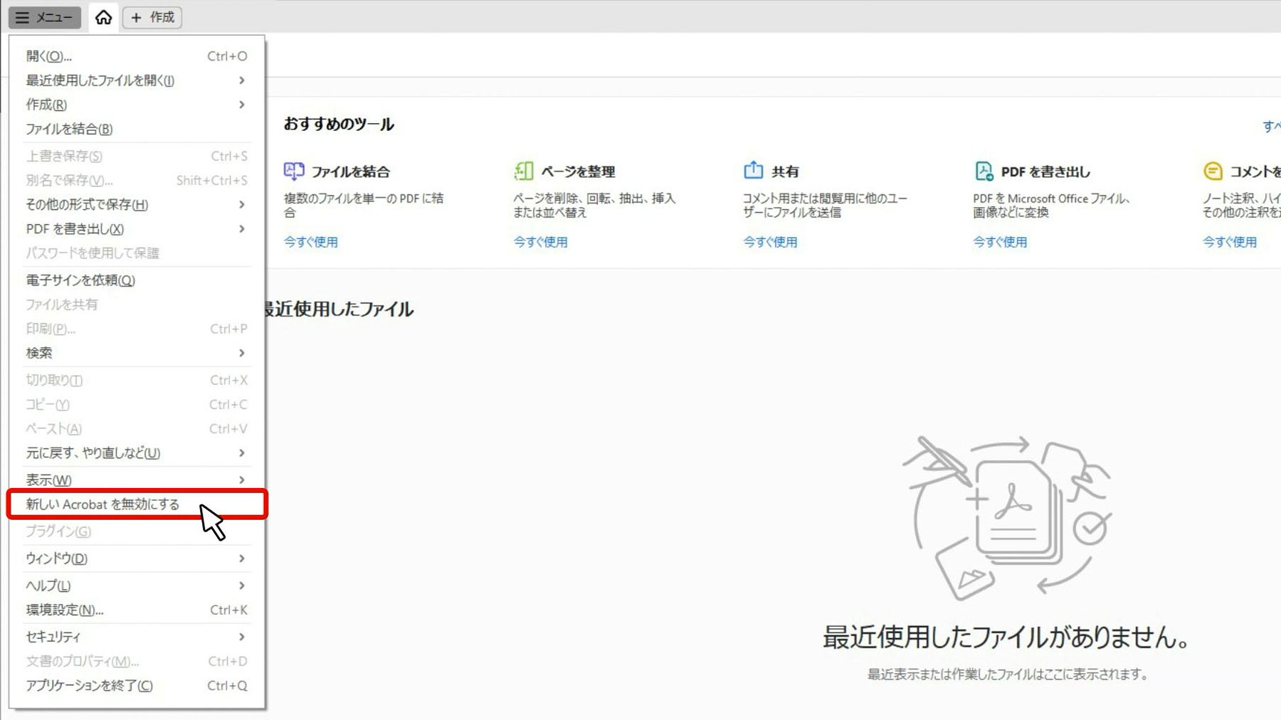 画面左上の「メニュー」をクリックし、「新しいAcrobatを無効にする」を選択することで以前の操作画面に切り替わります。また、いつでも新しい表示に戻すことも可能です。