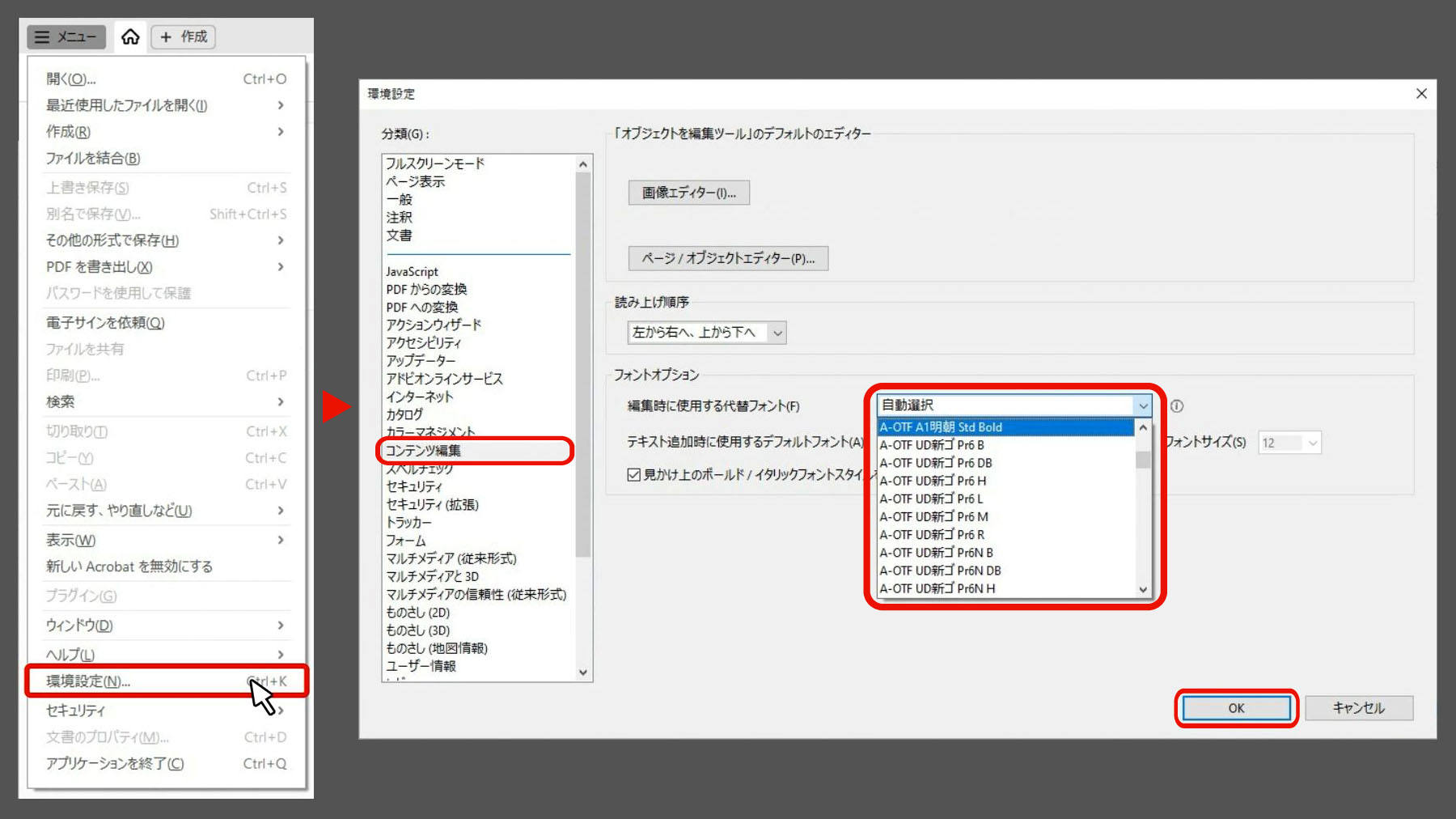 PDFを編集する際、元のフォントが見つからない場合に使われる代替フォントは、あらかじめ変更しておくことができます。