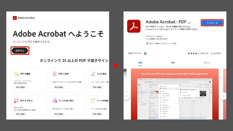 アドビのサイトでログインし、拡張機能を提供するストア「Google Workspace Marketplace」の、「Adobe Acrobat:PDF」のページにアクセスします。