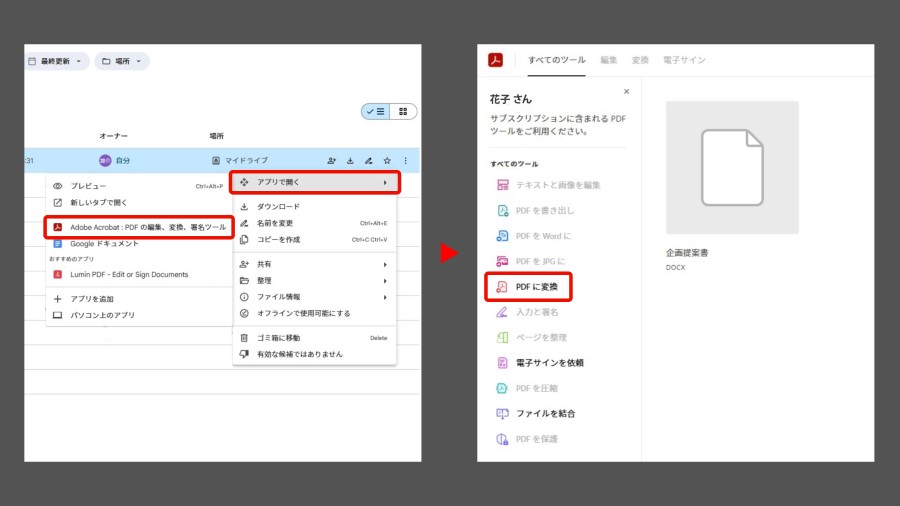 Adobe AcrobatとGoogle ドキュメントを連携することで、オンライン上でのPDFの変換・編集・管理をシンプルな手順で行えます。