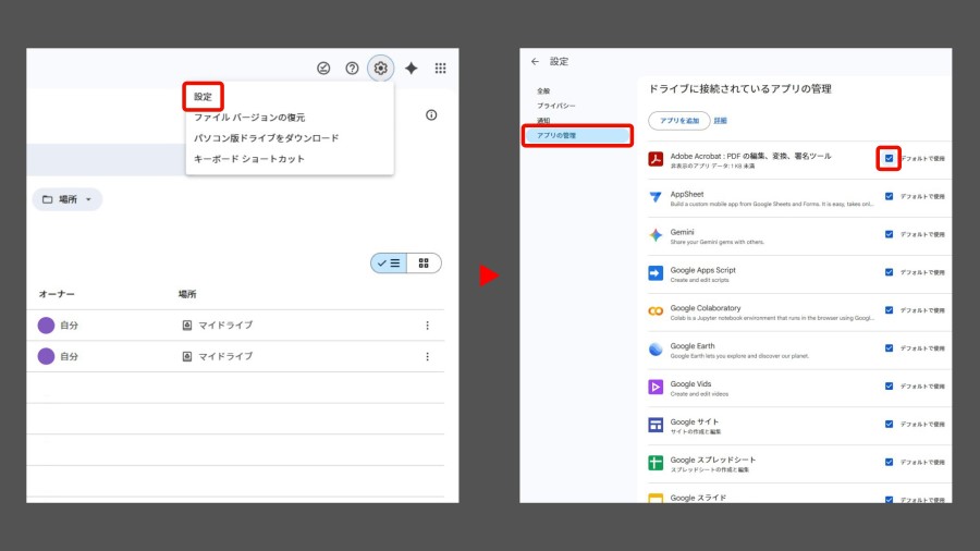 左側メニューの「アプリの管理」から、「Adobe Acrobat」の「デフォルトで使用」にチェックを入れておくと便利です。