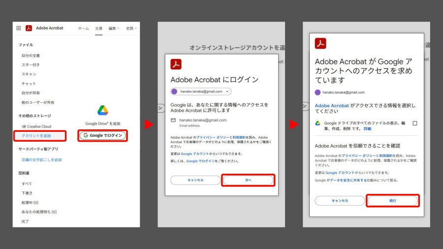Acrobatの画面から、Google ドライブ上のPDFをダウンロードせずに直接開いて編集することで、作業効率が上がります。Acrobatのサイトの「文書」タブで、「アカウントを追加」を選択し、「Googleでログイン」からログインします。「続行」をクリックすると、AcrobatがGoogle アカウントへアクセスすることが許可されます。