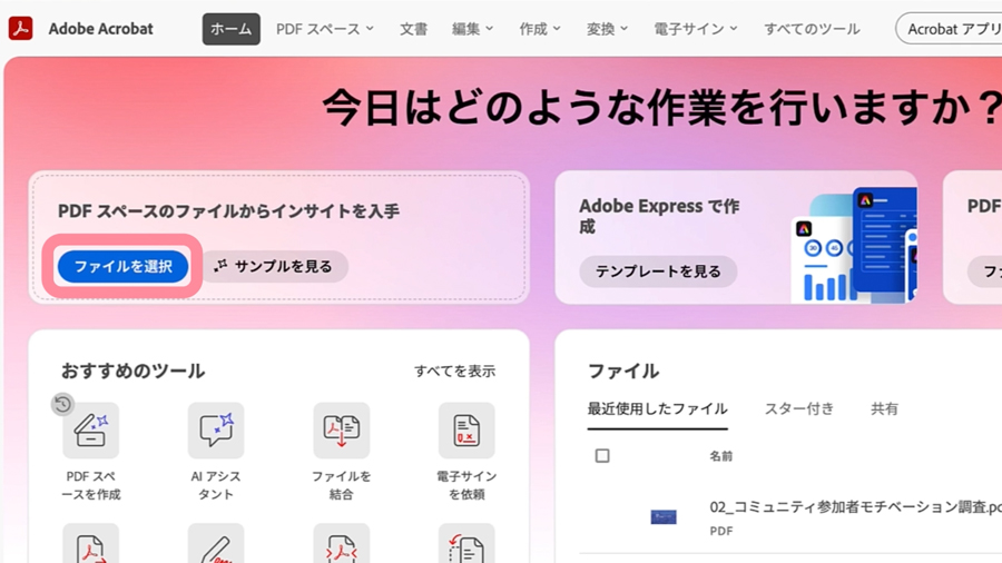 ① Acrobatのホーム画面から、PDF スペースの「ファイルを選択」をクリックします。