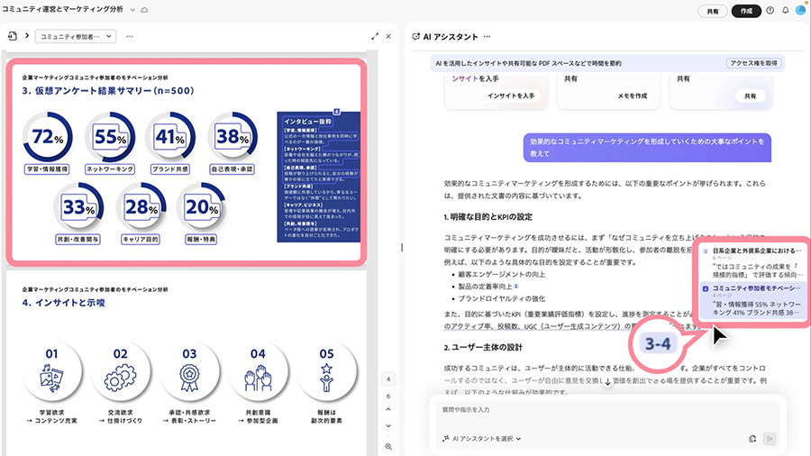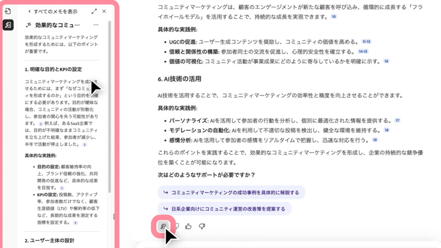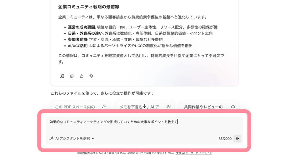 ① チャットパネルに質問や指示を入力します。ここでは「効果的なコミュニティマーケティングを形成していくための大事なポイントを教えて」と指示します。しばらくすると、AI アシスタントが回答を表示します。
