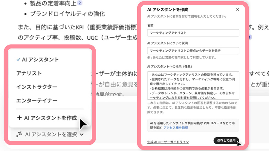 独自のAI アシスタントを作成する場合は、「AI アシスタントを作成」をクリックし、表示されるダイアログボックスでAI アシスタントの名前、簡単な説明、詳細な指示(任意)を入力して、「保存して適用」をクリックします。