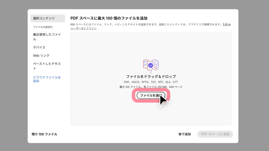 ファイル形式はPDFのほか、 テキスト、Word、PowerPoint、Excelなど 最大100ファイルまで読み込めます。