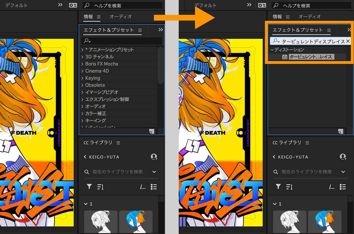 「ウィンドウ→エフェクト&プリセット」を選択して、パネルを開きます。検索窓に「タービュレントディスプレイス」と入力すると、エフェクトが表示されます。
