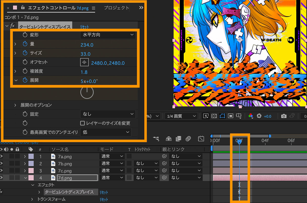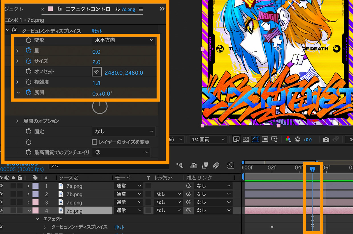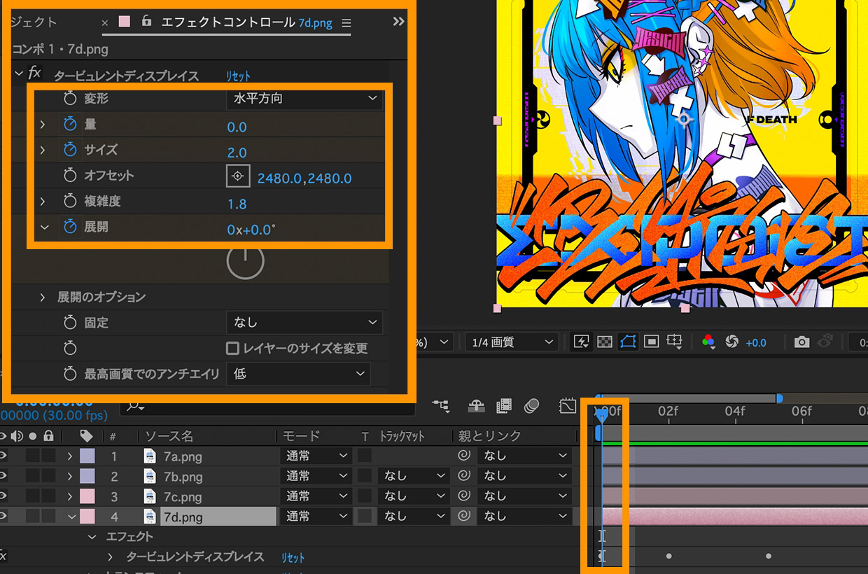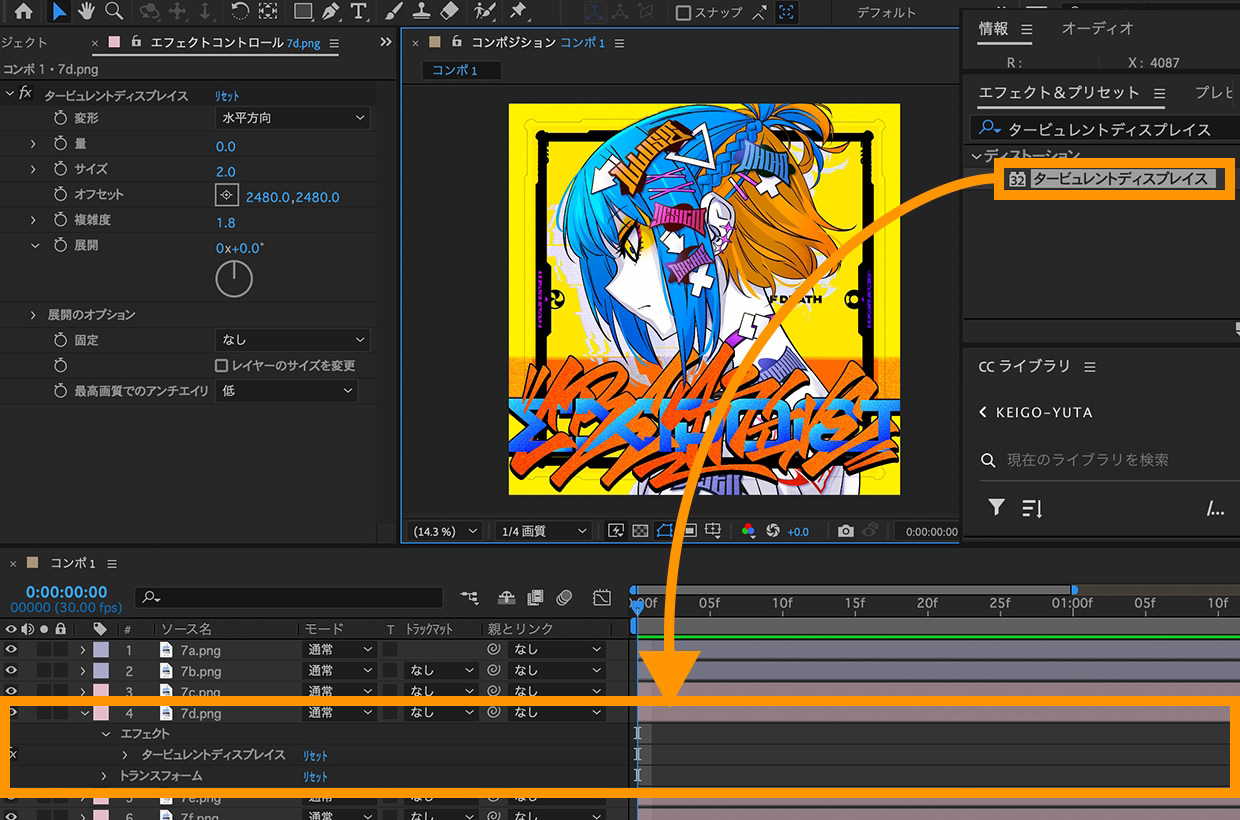 エフェクトパネルから「タービュレントディスプレイス」をドラッグしてソース「7d.png」にドロップします。