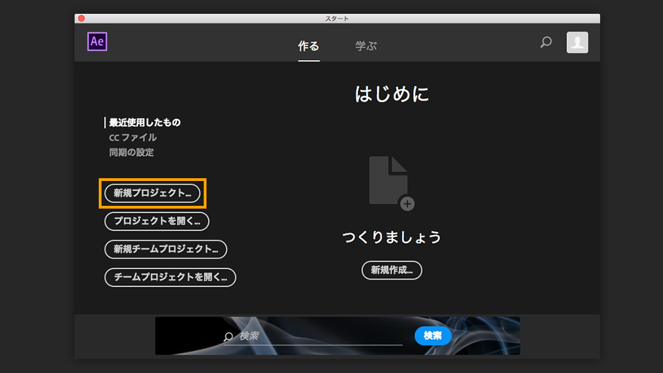 After Effectsを起動し、スタート画面の「新規プロジェクト」をクリックするか、「ファイル」→「新規」→「新規プロジェクト」を選択します。