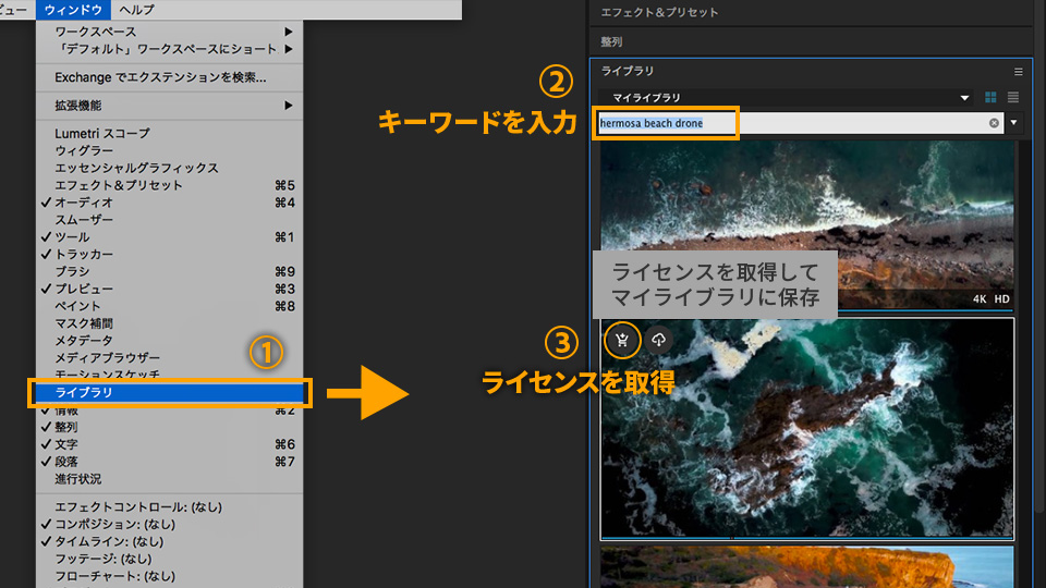 ビデオ素材がない場合は、Adobe Stockから素材を選んで使用することもできます。「ウインドウ」→「ライブラリ」を選択して、ライブラリパネルを開きます。「Adobe Stockを検索」フィールドに、検索したいビデオ素材のキーワードを入力します。素材の候補が表示されるので、使用したい素材にカーソルを合わせ、ショッピングカートのアイコンをクリックしてライセンスを取得します。また、クラウドのアイコンをクリックすると、ウォーターマークの入ったプレビュー版を無償で試用することができます。