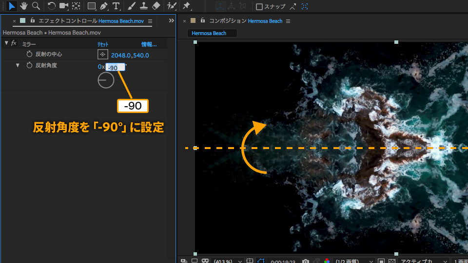 エフェクトコントロールパネルで、反射角度を「-90°」に設定します。水平の中心線から下側の映像が反転し、上側に映ります。