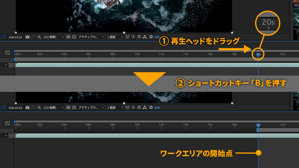 今回は、素材の20秒以降を使用するので、再生ヘッド(現在の時間インジケーター)をタイムライン上の20sまでドラッグし、ショートカットキー「B」を押します。ここがワークエリアの開始点となります。(終了点の設定は、ショートカットキー「N」を押します)