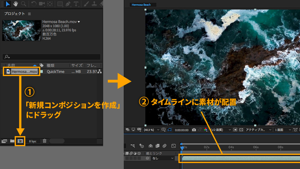 プロジェクトパネルで「Hermosa Beach.mov」を選択し、パネル下の「新規コンポジションを作成」までドラッグします。マウスをはなすと、タイムラインに素材が配置され、モニター画面に映像が表示されます。